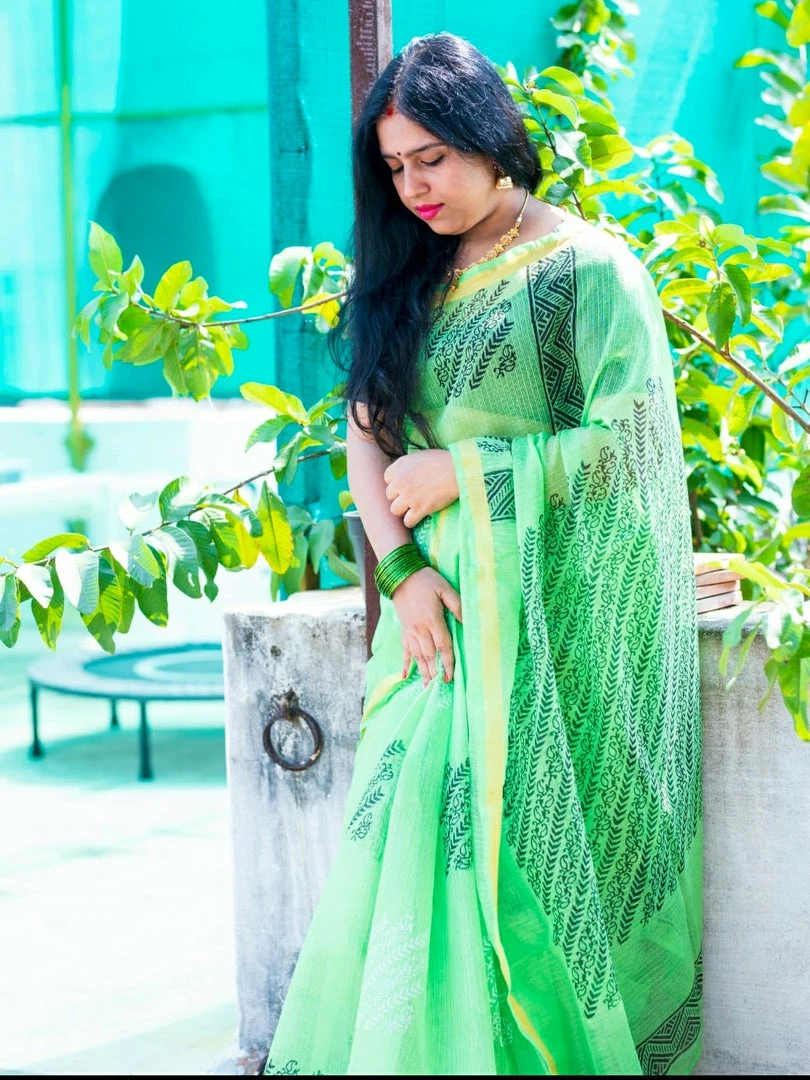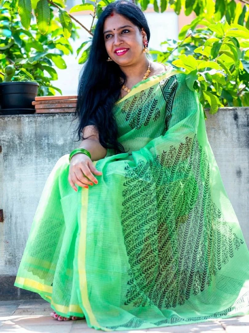 This is a hand block printed Kota saree. Our Kota sarees are directly sourced from the weavers in Kota, Rajasthan. Kota sarees are extremely lightweight and very easy to drape. This weave has tiny square like patterns known as ‘khats’ all over the saree.