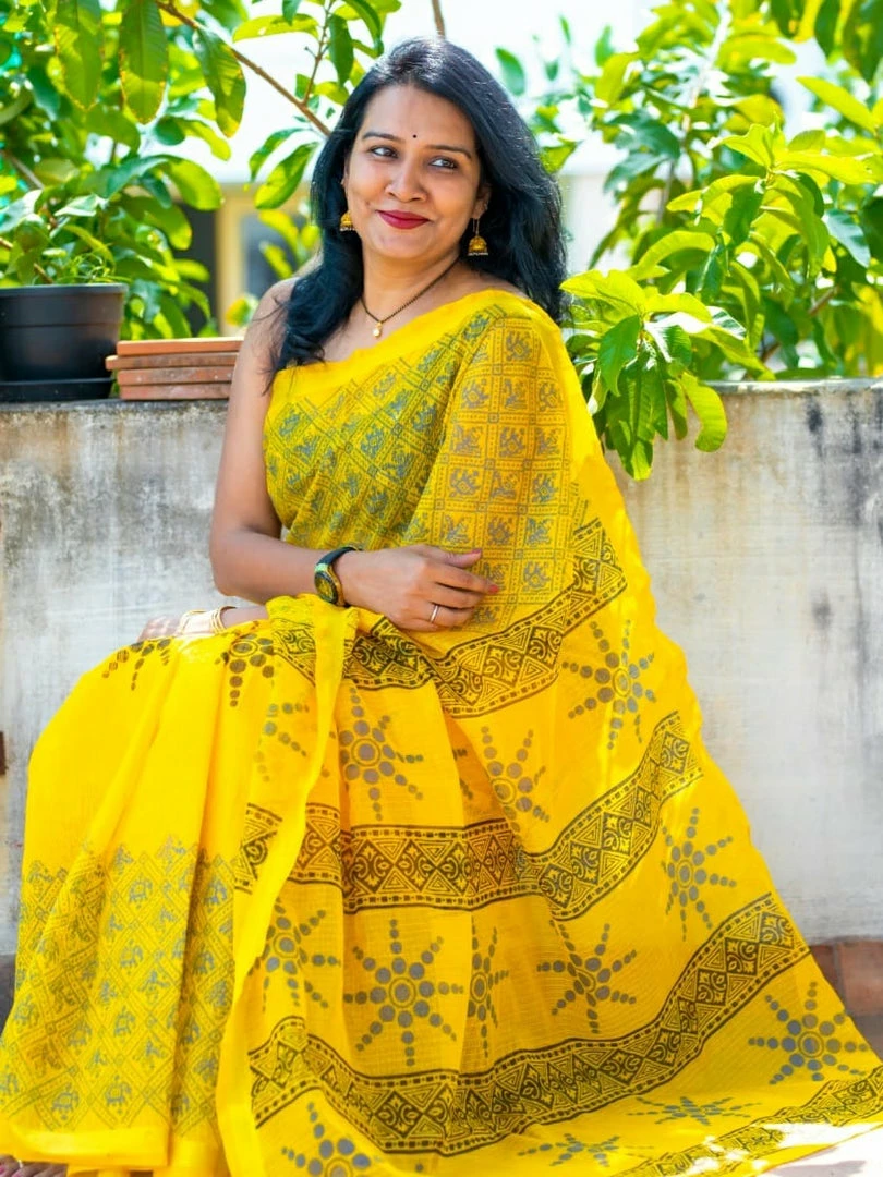 This is a hand block printed Kota saree. Our Kota sarees are directly sourced from the weavers in Kota, Rajasthan. Kota sarees are extremely lightweight and very easy to drape. This weave has tiny square like patterns known as ‘khats’ all over the saree.