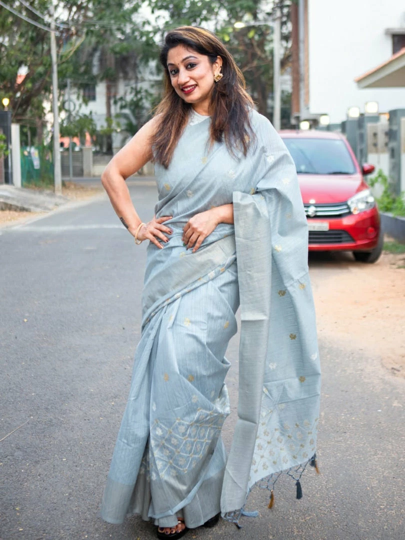 Jute linen saree in soothing pastel shade with thread embroidered motifs all over the saree, finished with subtle shimmer gold border on either sides and a well defined, embroidered pallu. This saree is exudes class and elegance and the pastel colour palette makes this a beautiful adornment in every lady’s wardrobe.Â
