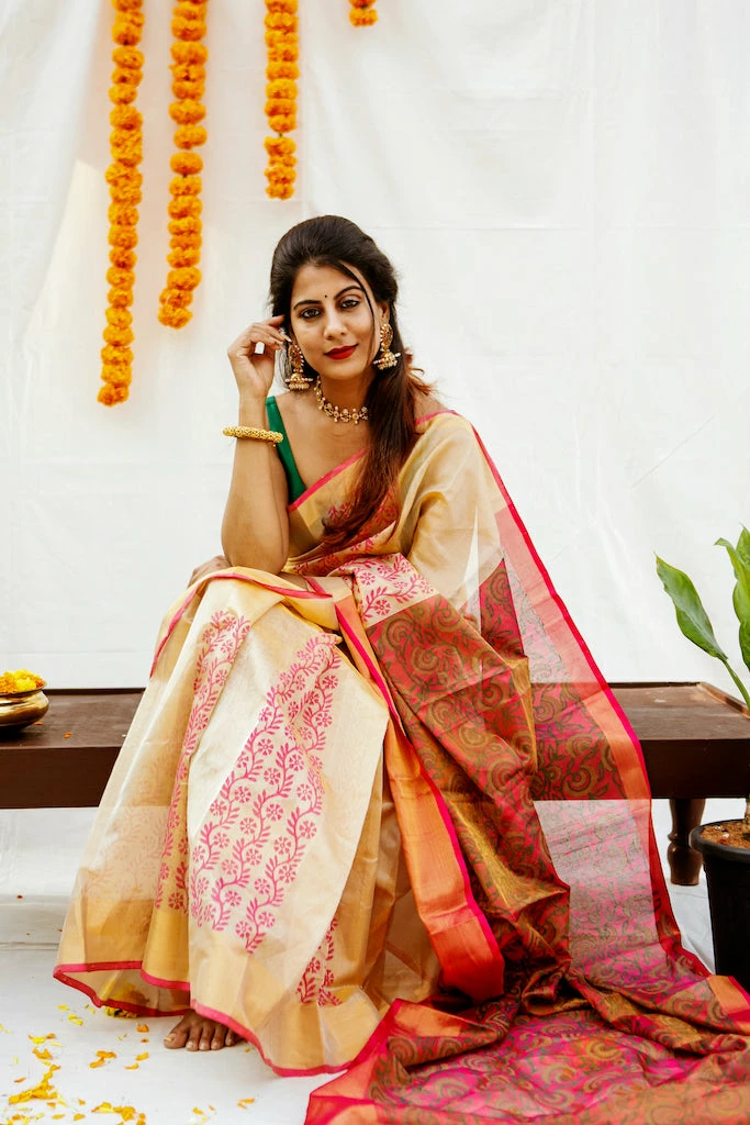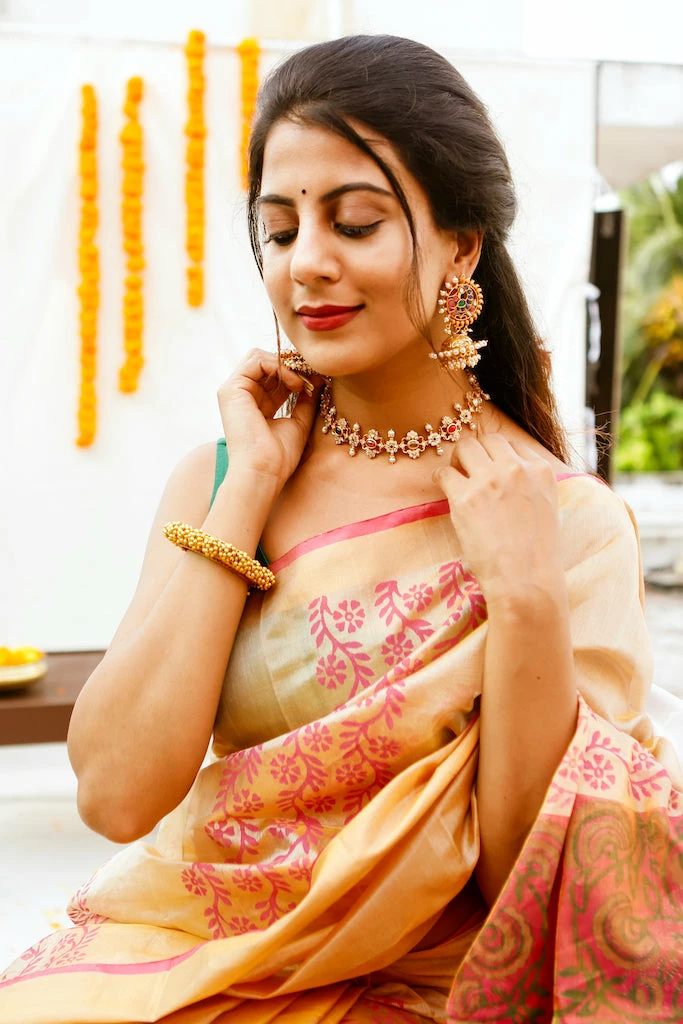 Fabric: Hand woven Uppada Tissue Silk, light weight and semi transparent. Can be easily draped with single pleat.