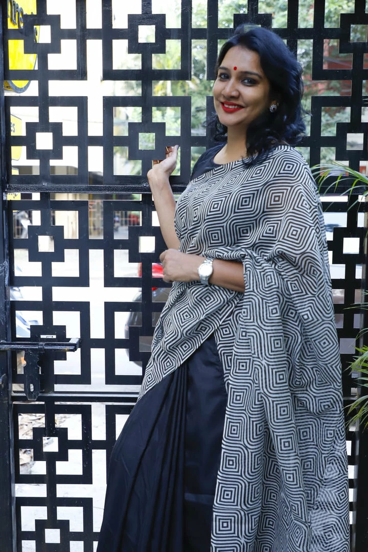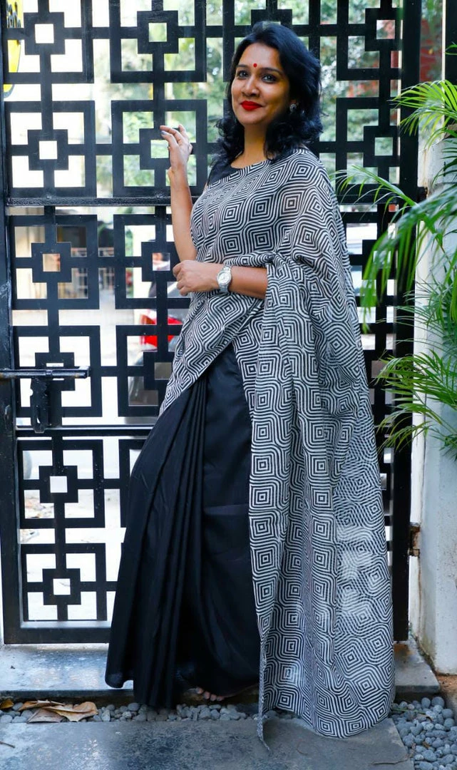 Half and half chanderi saree with geometric block prints on pallu. A classy, yet modern combination.Â