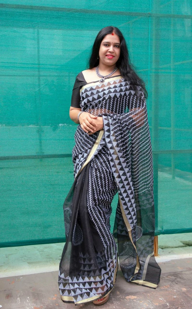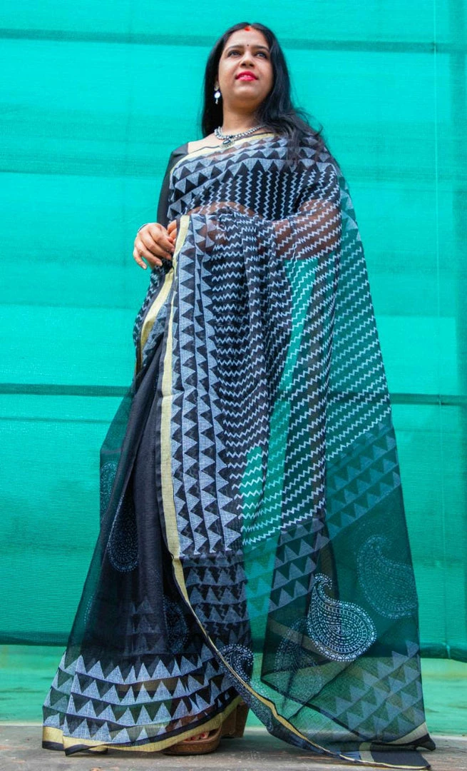 Pure cotton Kota saree with chevron and paisley handblock prints. This saree is lightweight and easy to carry off.