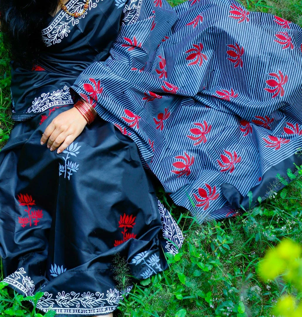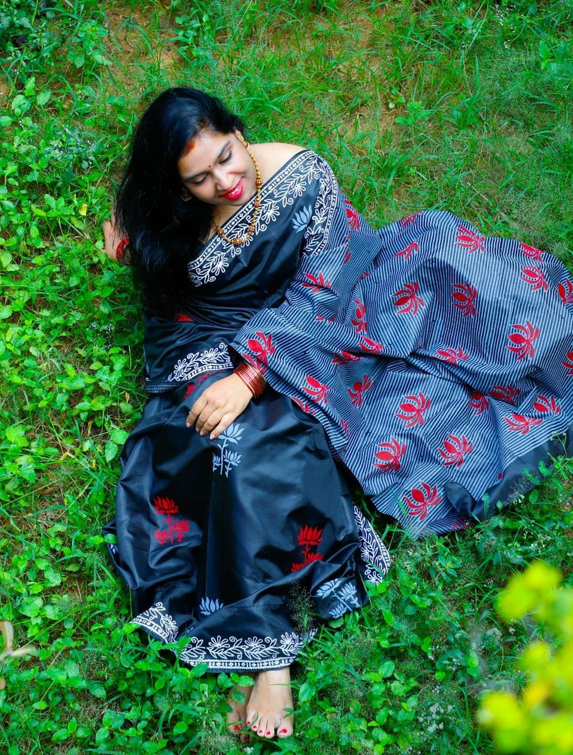 Black paper silk saree with beautiful hand block prints in white and deep red. This saree is extremely lightweight, soft and very easy to drape.Â