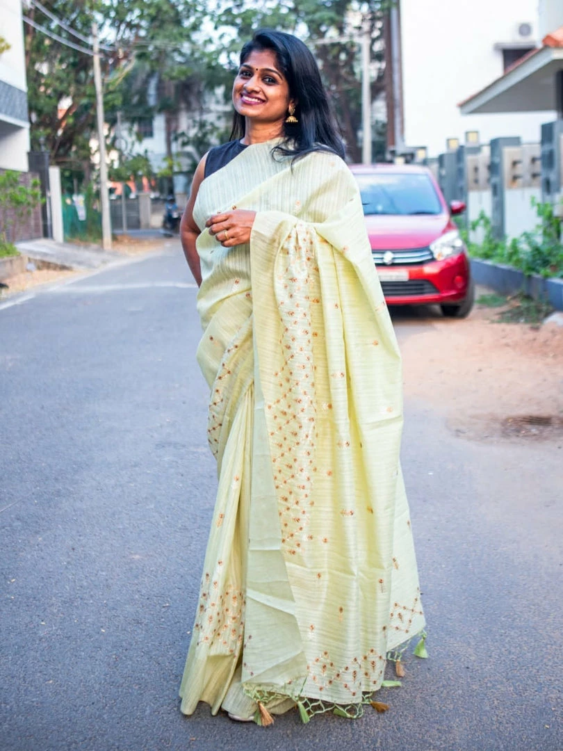 Jute linen saree in soothing pastel shade with thread embroidered motifs all over the saree, finished with subtle shimmer gold border on either sides and a well defined, embroidered pallu. This saree is exudes class and elegance and the pastel colour palette makes this a beautiful adornment in every lady’s wardrobe.Â