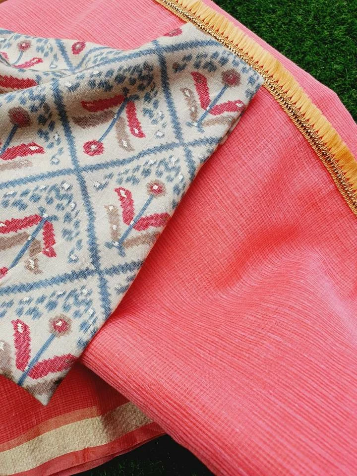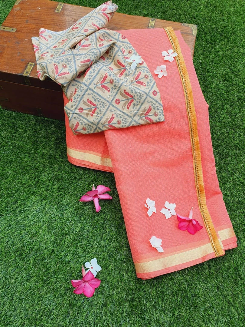 Pure, plain cotton Kota Doria saree with narrow gold border, finished with a tassel detailing on pallu, beautifully teamed up with a floral printed blouse piece of one metre. This saree is extremely lightweight and easy to carry off.