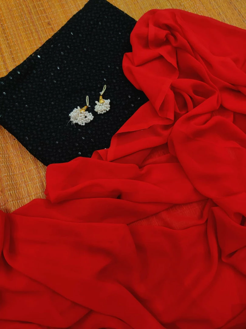 Soft and flowy plain gorgette saree in bright red. The fabric is extremely lightweight and easy to drape. It is semi transparent when worn as single pleat.