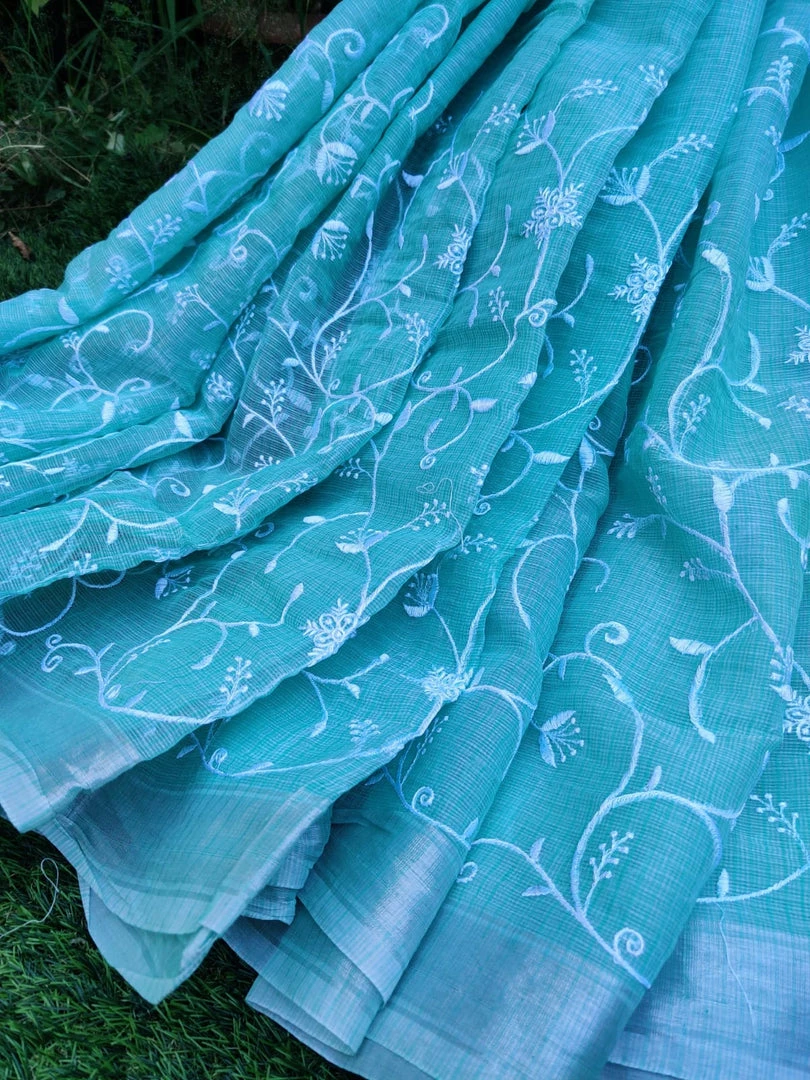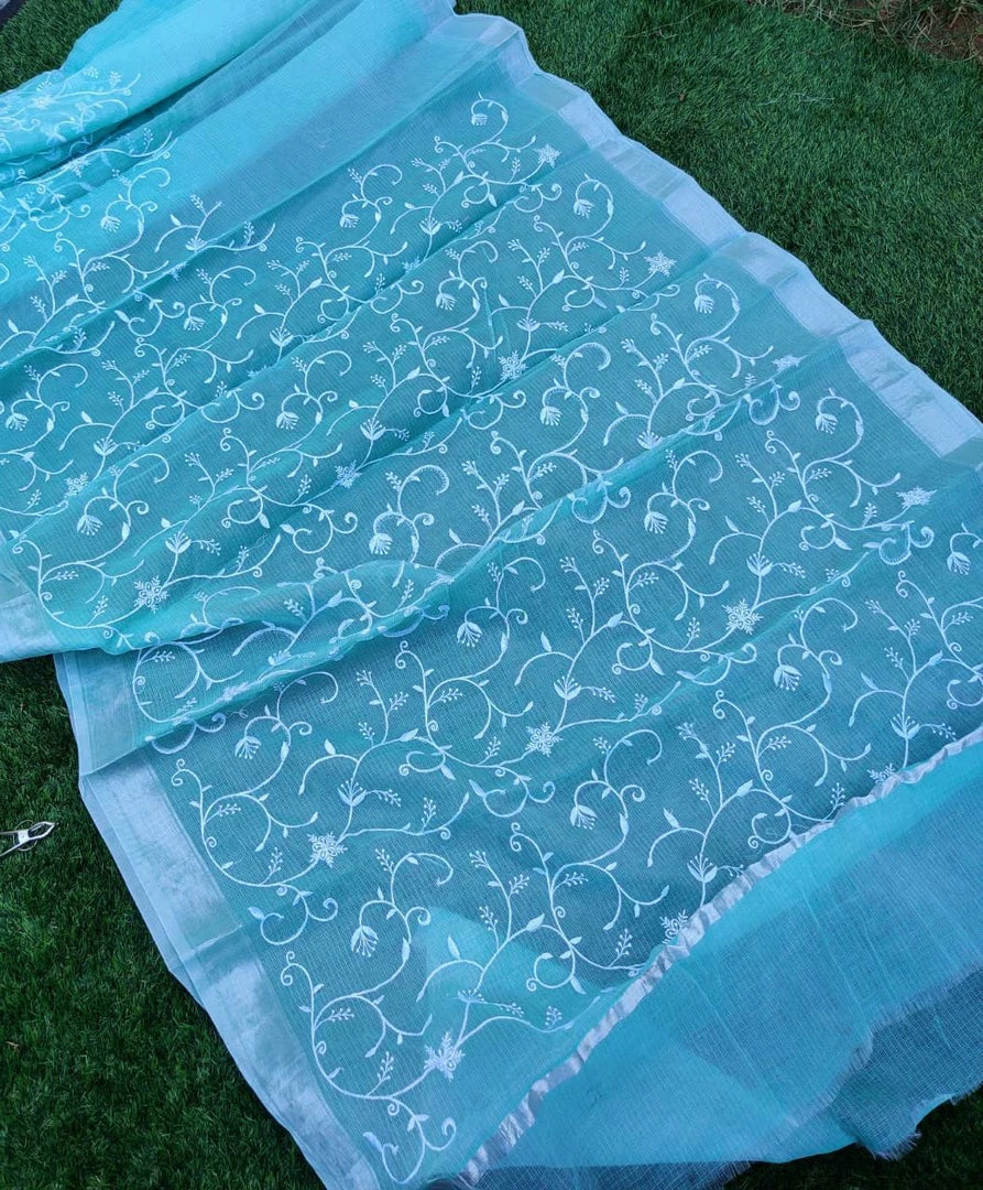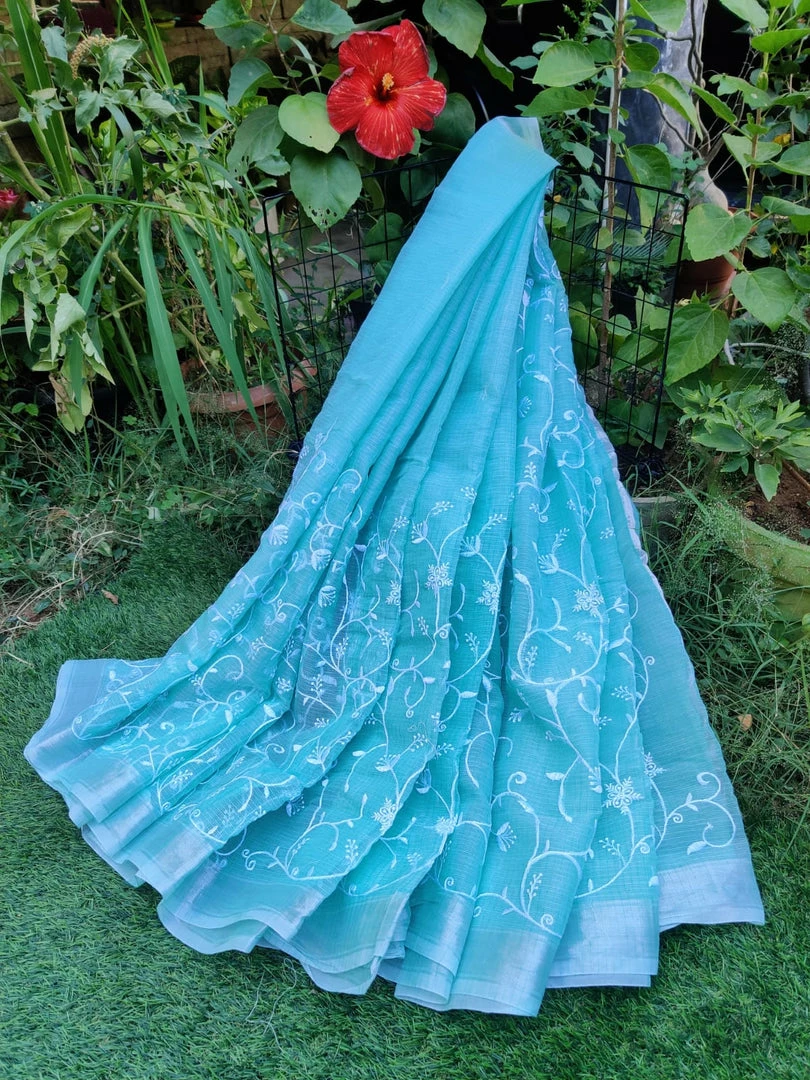 Pure Kota Doria saree with white thread embroidered floral motifs, finished with a subtle silver border on both sides. This saree is extremely lightweight and easy to carry off.
