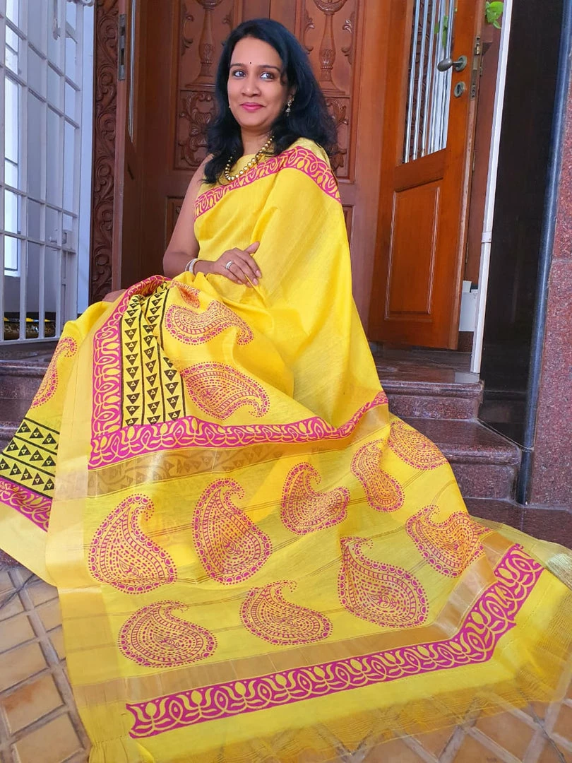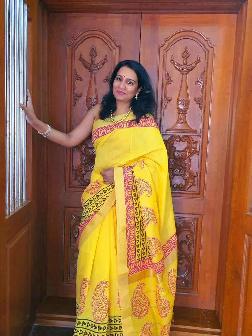 This is a hand block printed Silk Cotton Saree. The saree fabric is sourced from weavers down south and then further designed using handblock prints. The saree has narrow gold border.Â