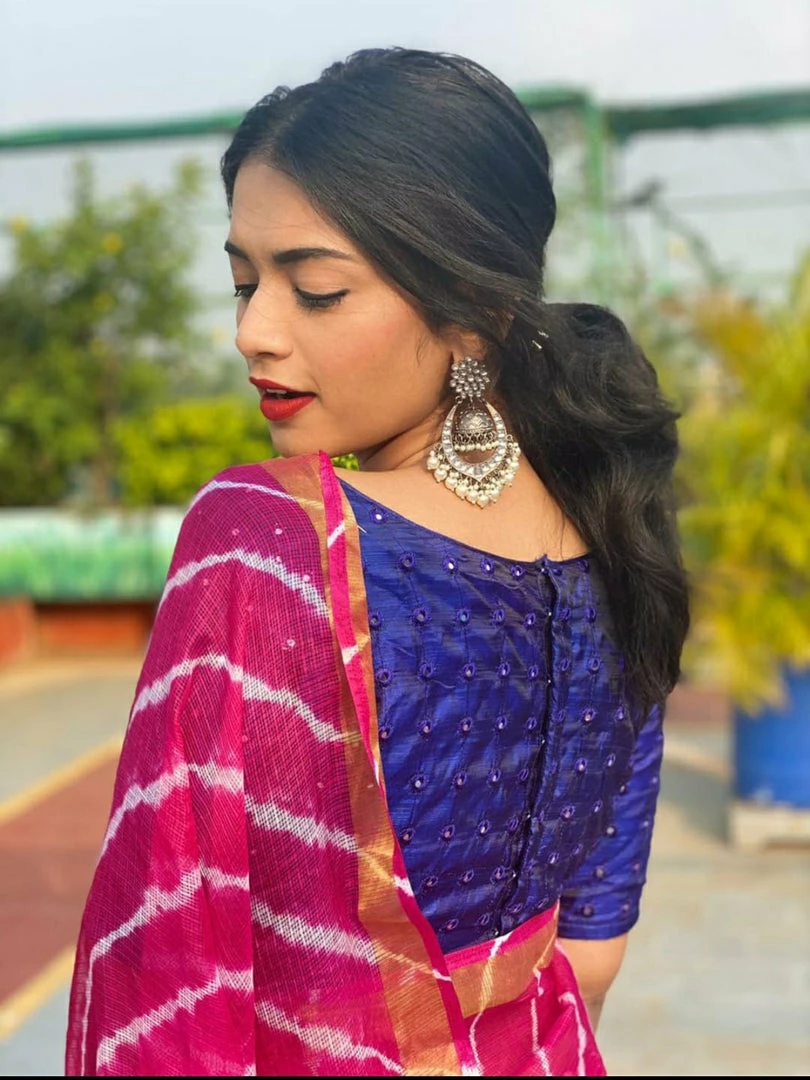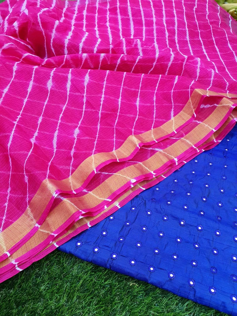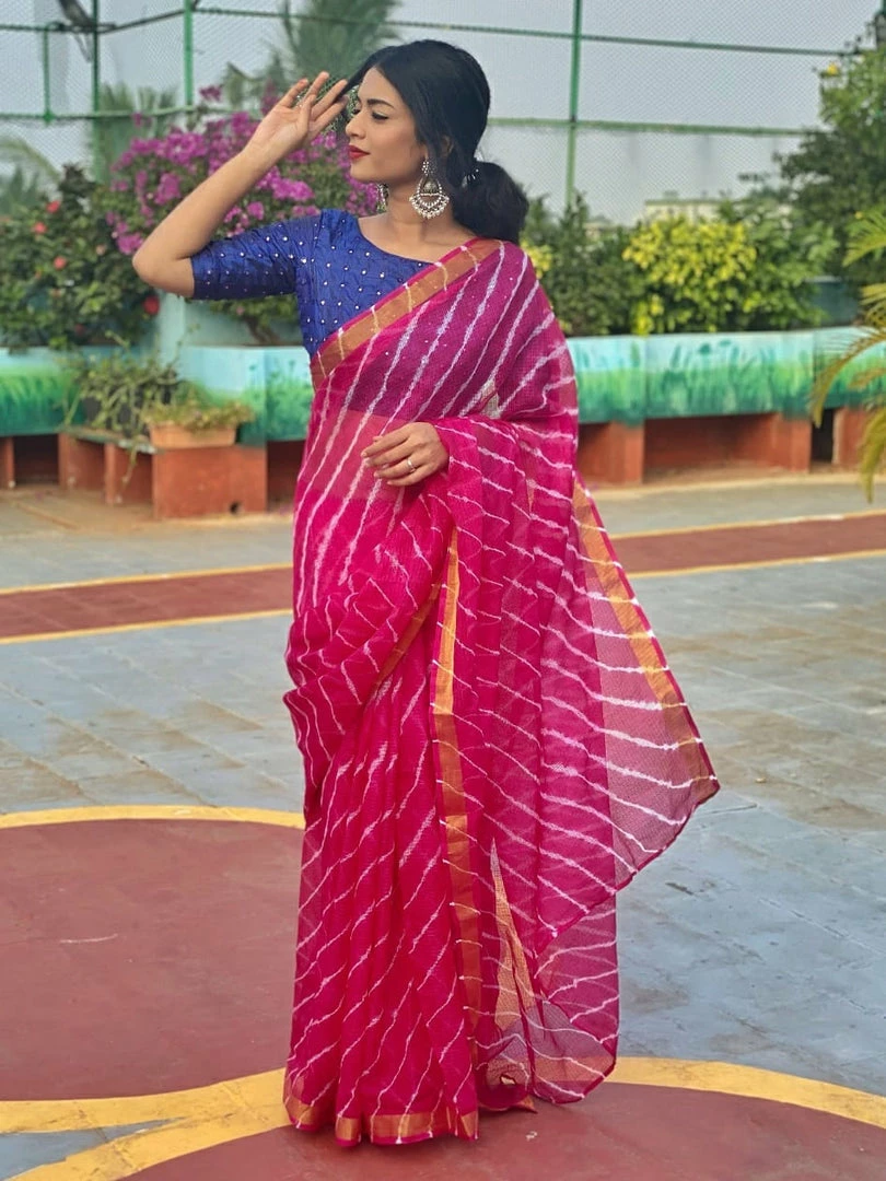 Kota sarees are extremely lightweight and very easy to drape. This weave has tiny square like patterns known as ‘khats’ all over the saree. This particular collection of Kota sarees has leheriya designs on them. This is achieved by a tie and dye technique. These sarees are hand dyed to perfection by highly skilled dyers, using vibrant colours.