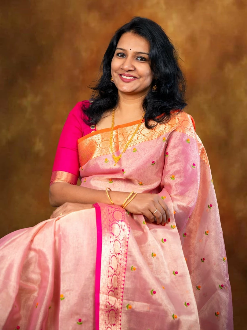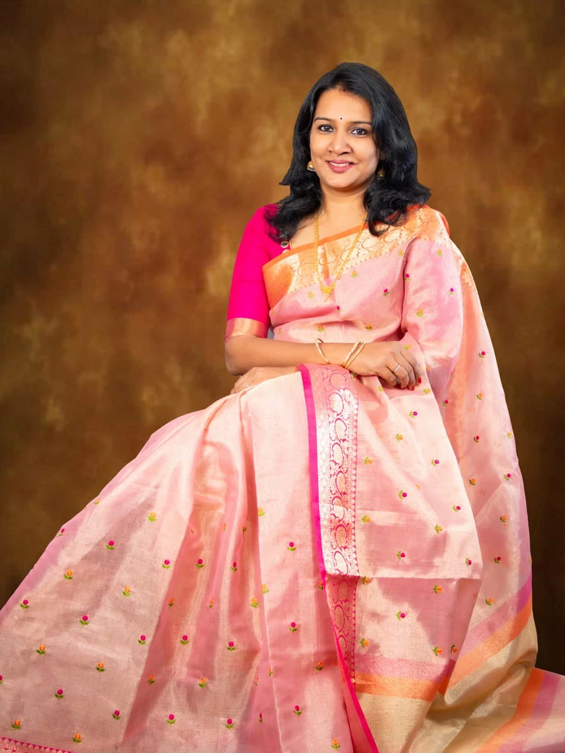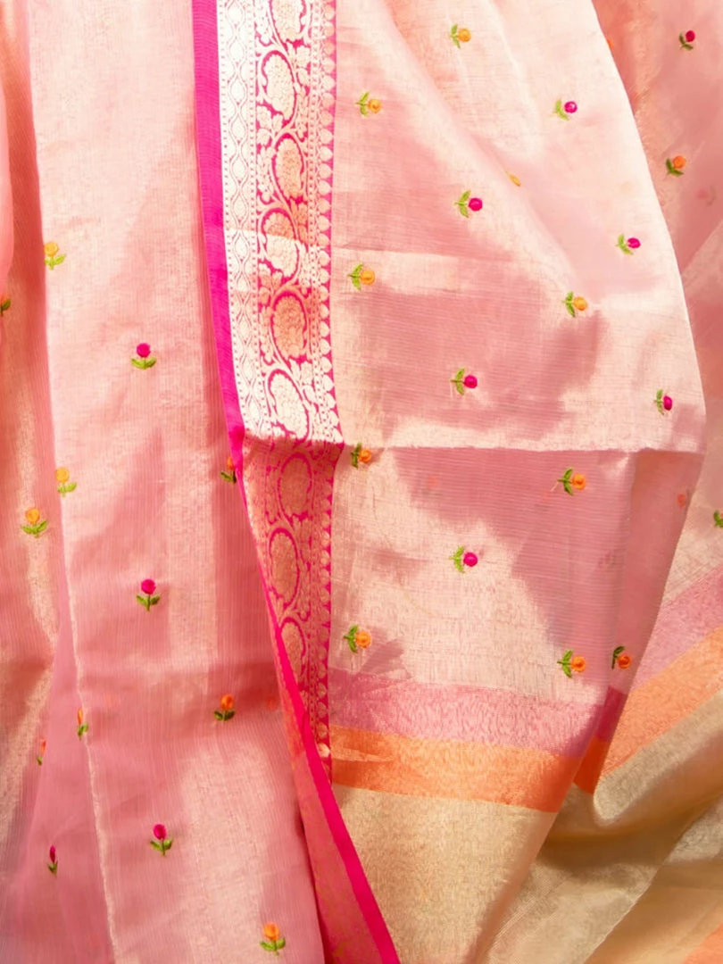 This particular collection of Kota tissue silks also have tiny floral thread embroidery all over the saree. Also, these have beautiful ‘ganga jamuna’ border in bright pink and orange.