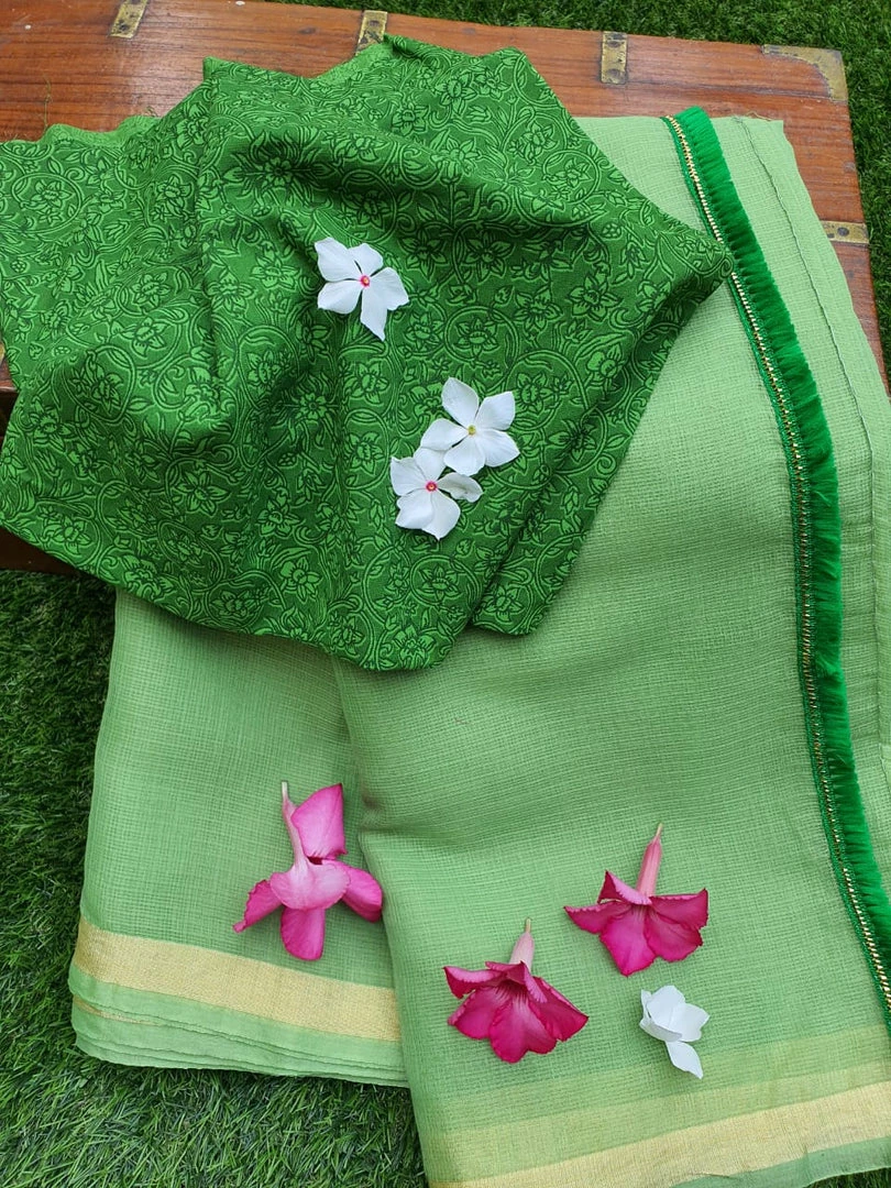 Pure, plain cotton Kota Doria saree with narrow gold border, finished with a tassel detailing on pallu, beautifully teamed up with a floral printed blouse piece of one metre. This saree is extremely lightweight and easy to carry off.