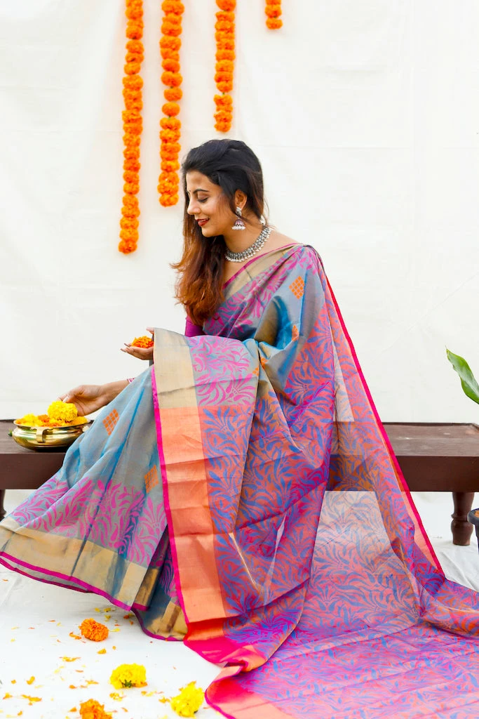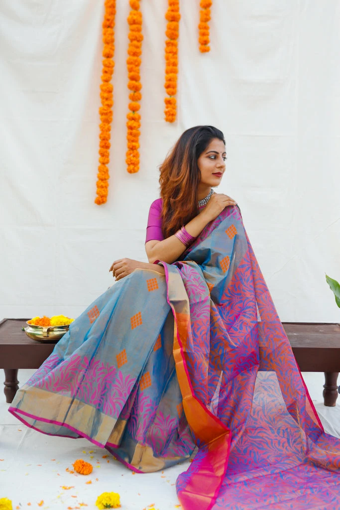 Fabric: Hand woven Uppada Tissue Silk, light weight and semi transparent. Can be easily draped with single pleat.