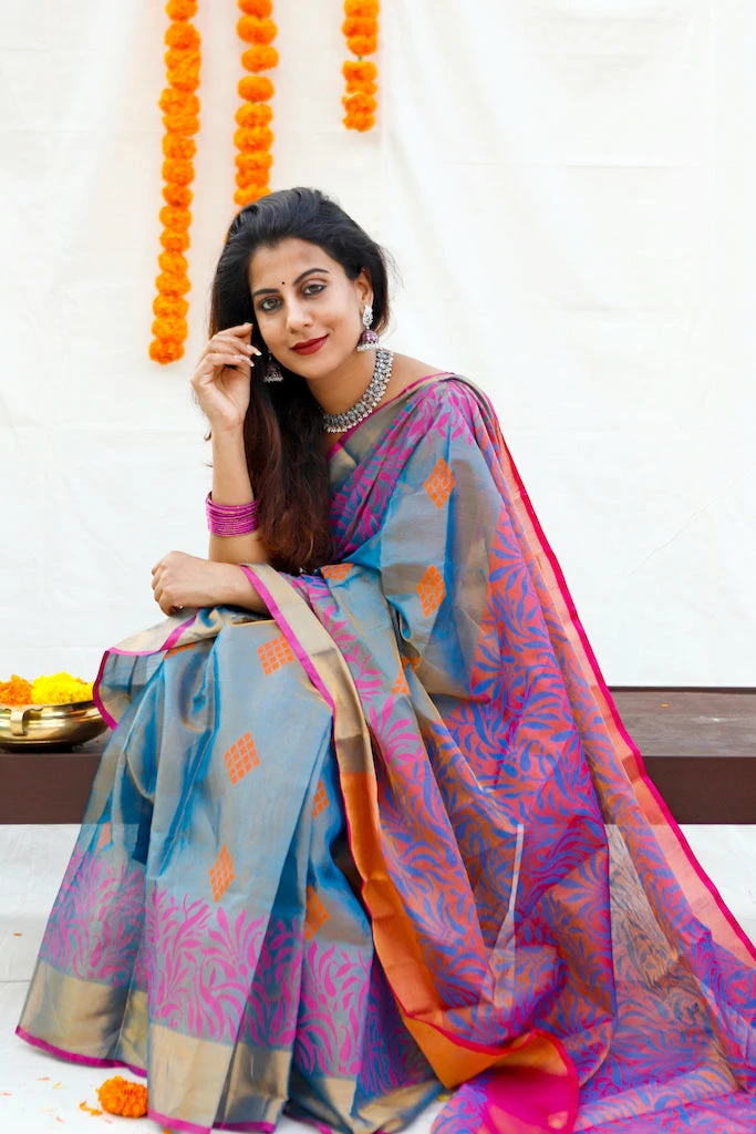 This Silk Collection is a beautiful combination of modern prints and traditional weave. Hand woven Uppada Tissue Silk saree in vibrant colours with eye catching handblock prints.