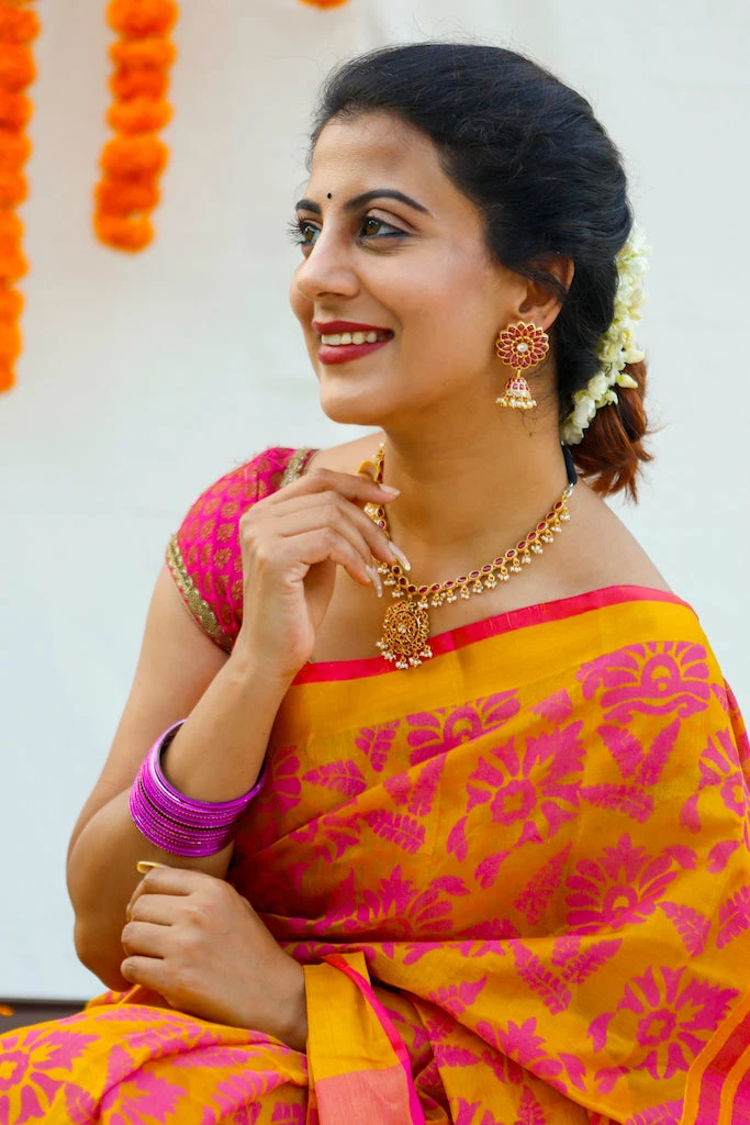 Fabric: Hand woven Uppada Tissue Silk, light weight and semi transparent. Can be easily draped with single pleat.