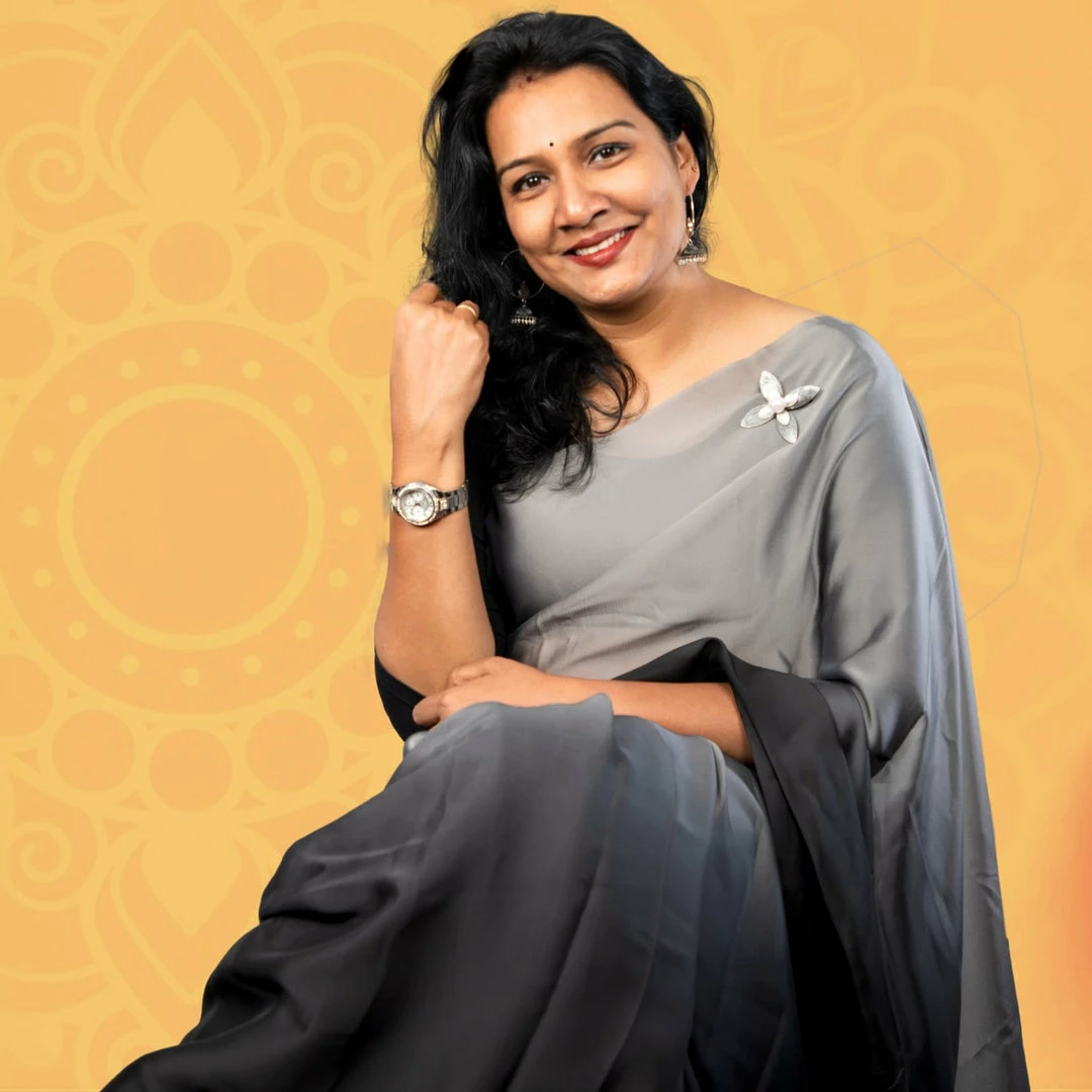 Beautiful ombre shaded satin chiffon saree in peach and grey. The fabric is extremely lightweight and easy to drape. It is non transparent, thus making it easy to wear single pleat as well.