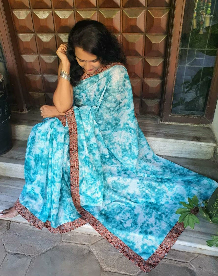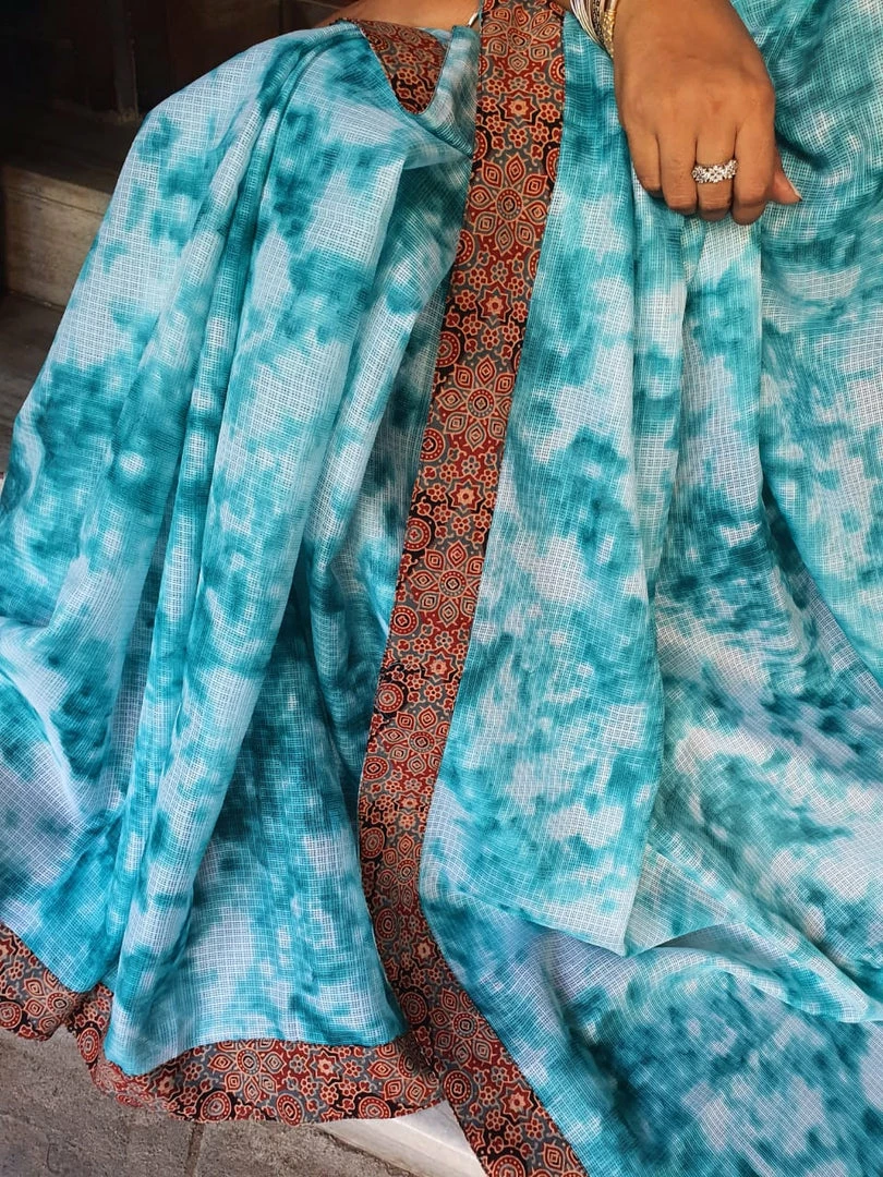 In this particular collection, we have given custom designed ajrakh patch work borders for silk kota sarees with vibrant colour burst pattern all over.