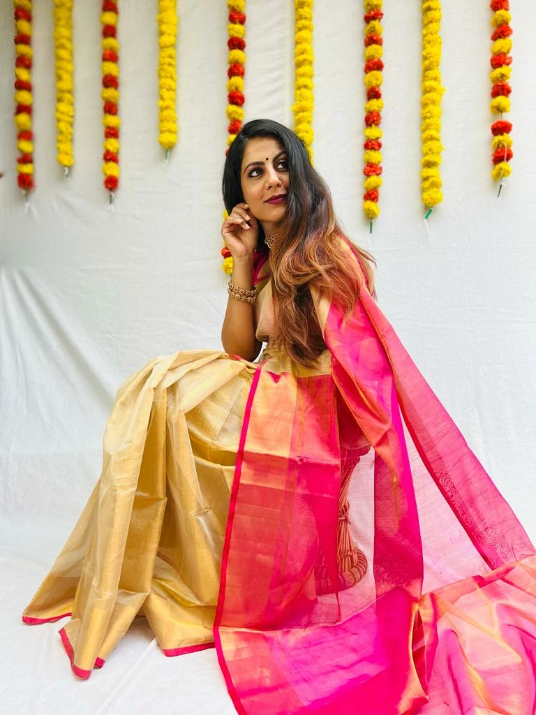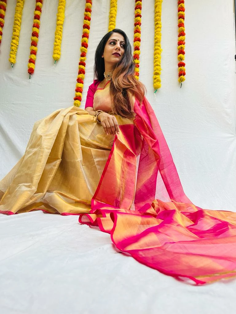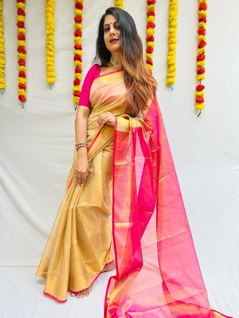 Fabric: Hand woven Uppada Tissue Silk, light weight and semi transparent. Can be easily draped with single pleat.