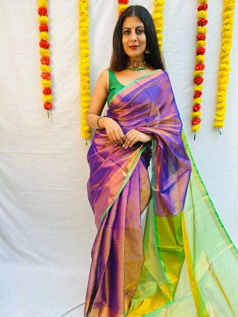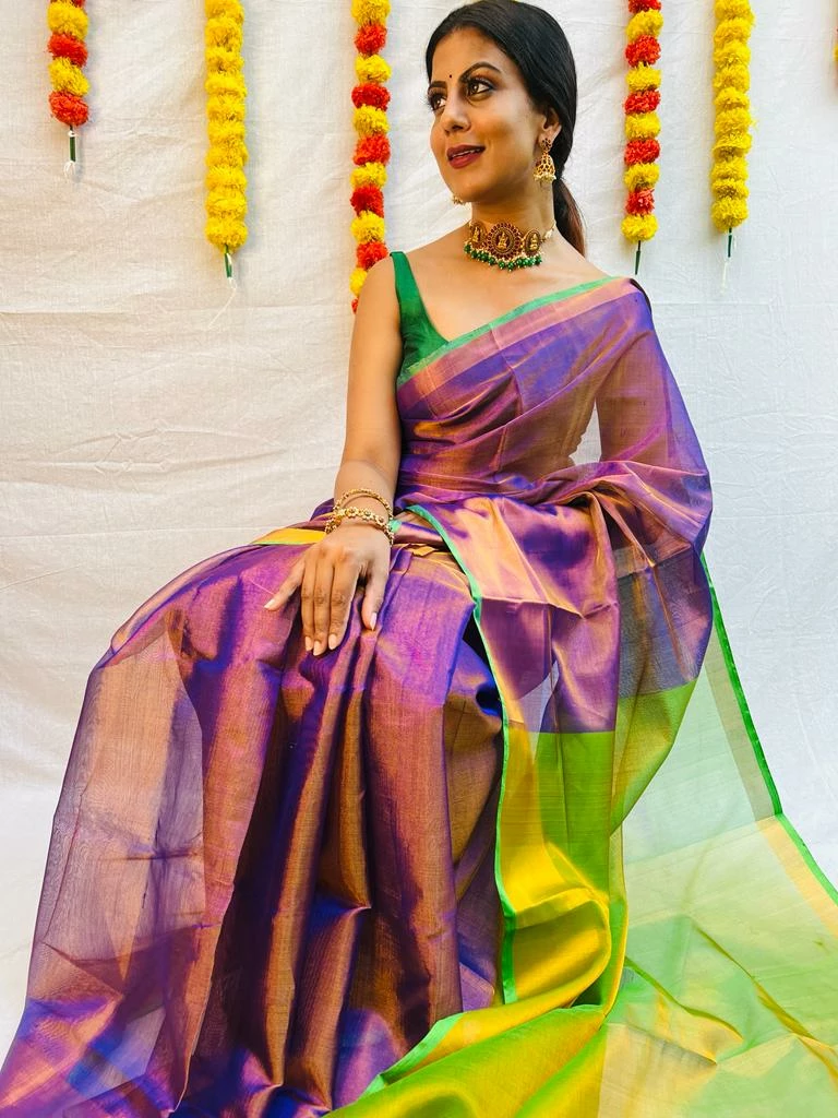 Fabric: Hand woven Uppada Tissue Silk, light weight and semi transparent. Can be easily draped with single pleat.