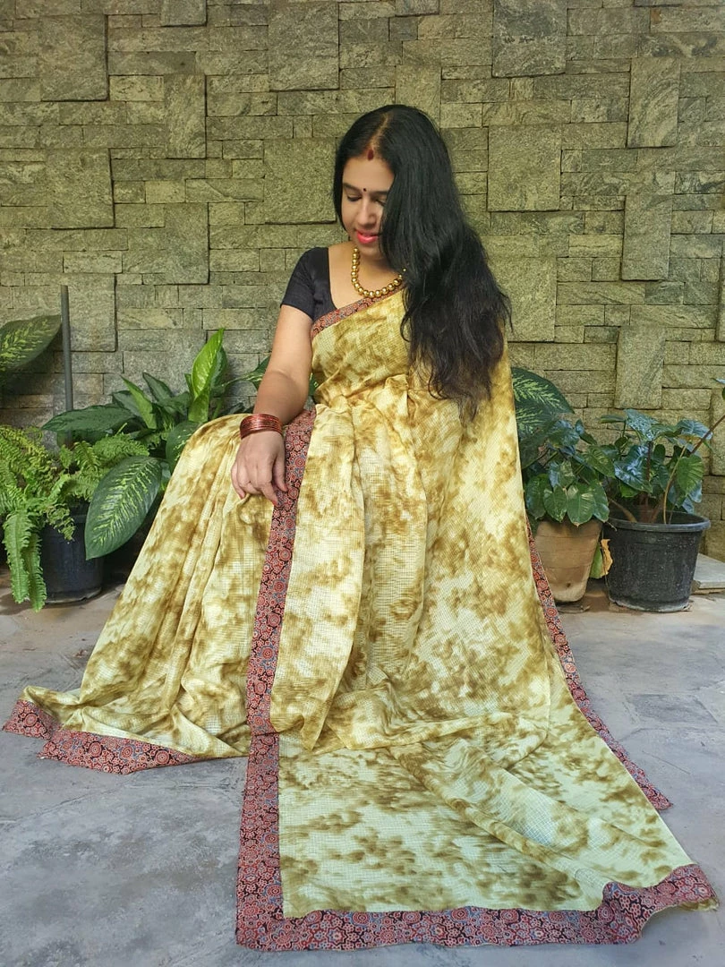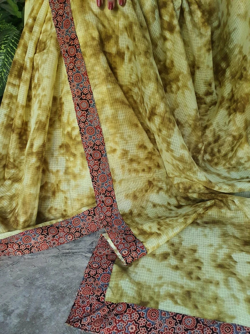 In this particular collection, we have given custom designed ajrakh patch work borders for silk kota sarees with vibrant colour burst pattern all over.