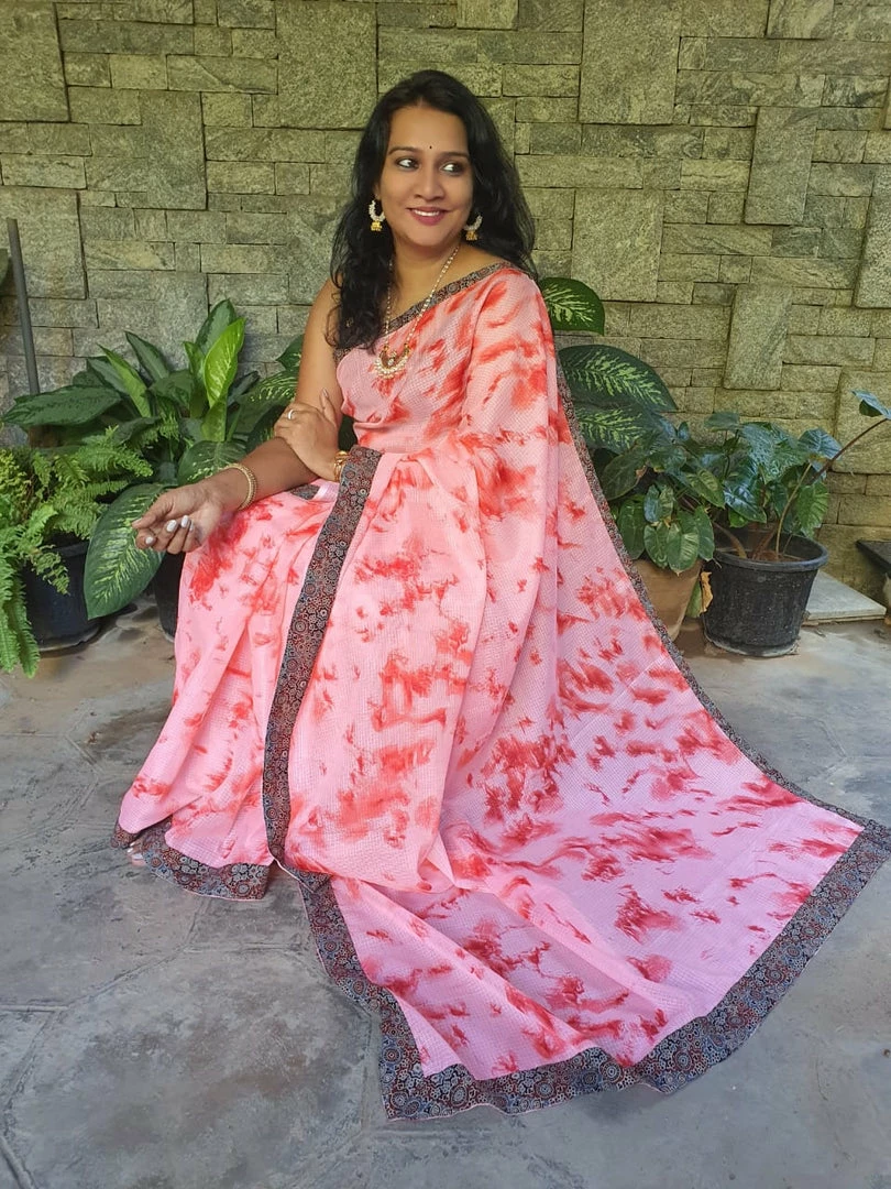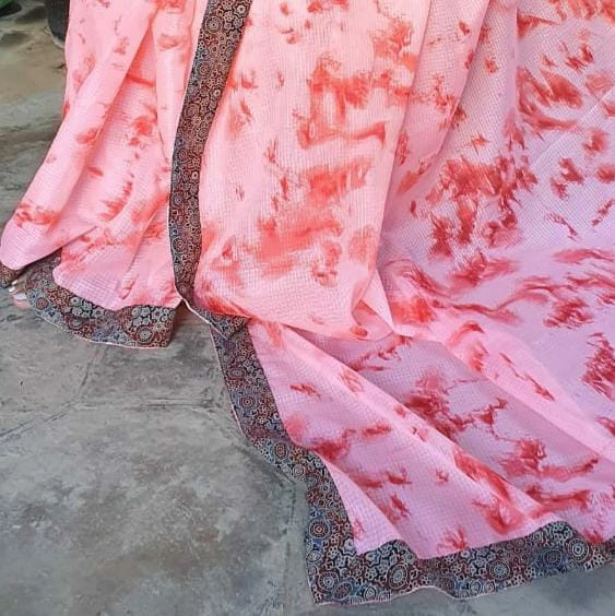 In this particular collection, we have given custom designed ajrakh patch work borders for silk kota sarees with vibrant colour burst pattern all over.
