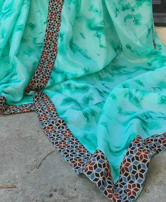 In this particular collection, we have given custom designed ajrakh patch work borders for silk kota sarees with vibrant colour burst pattern all over.