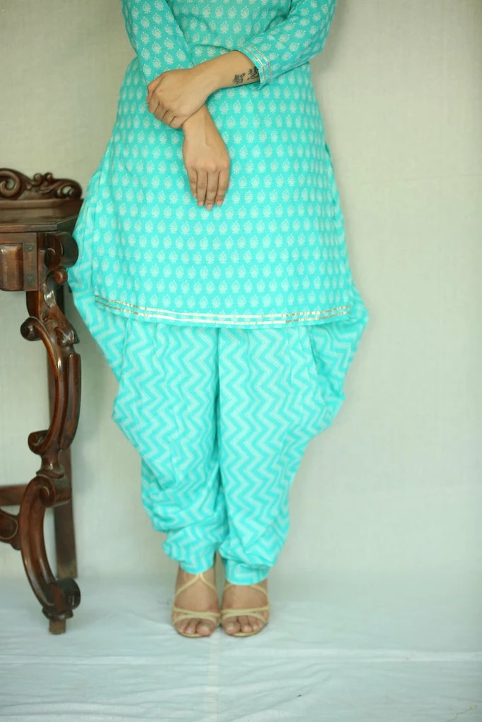 Short Kurtis are back in fashion and this top is teamed up with a smart dhoti style Salwar. This elegant design is a perfect blend of traditional and contemporary style and is sure to add charm and sophistication to your dressing