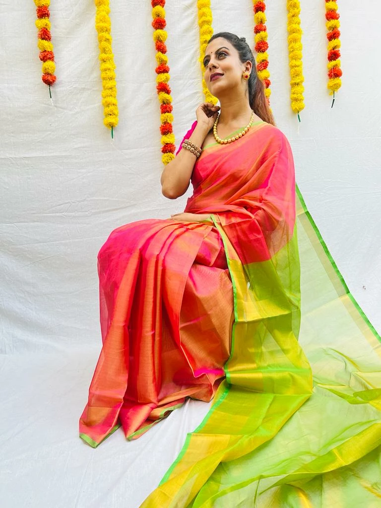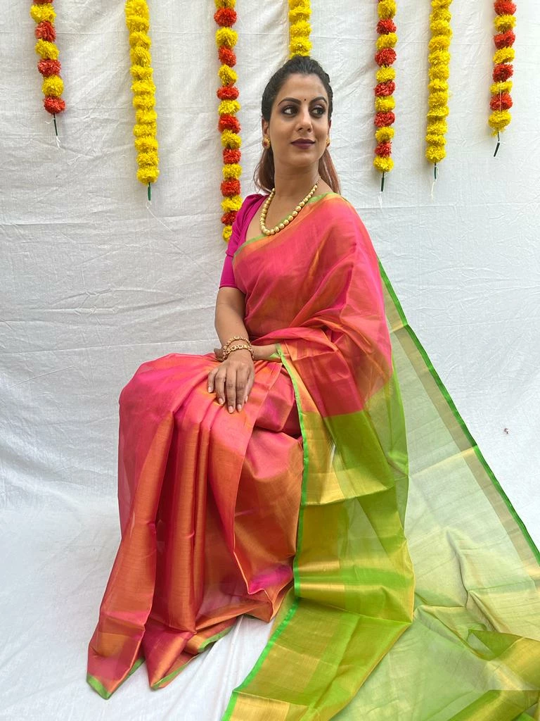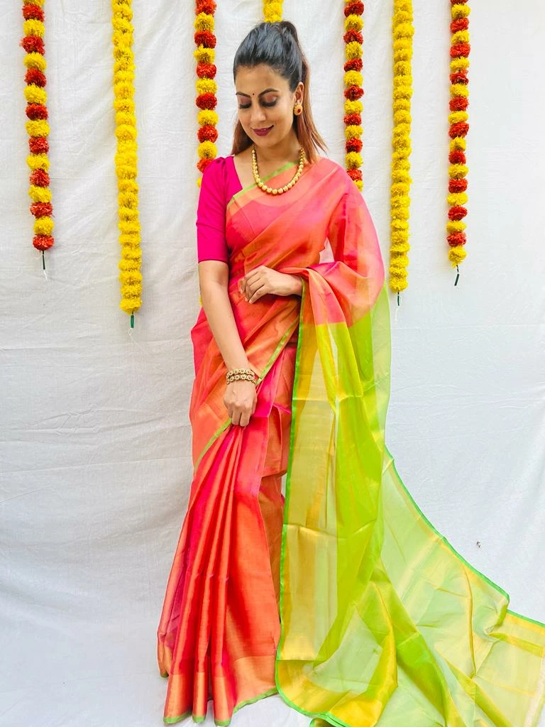 Fabric: Hand woven Uppada Tissue Silk, light weight and semi transparent. Can be easily draped with single pleat.