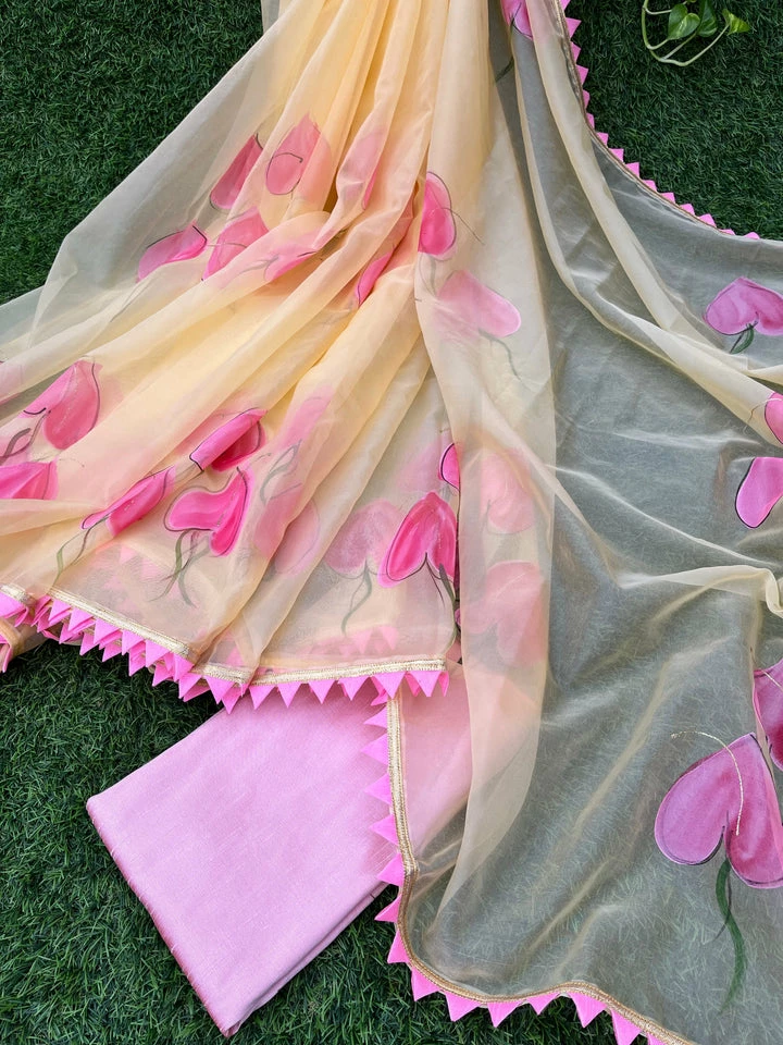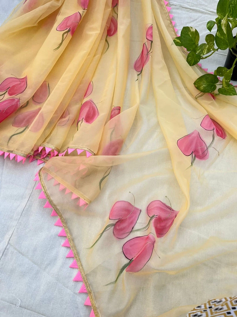 Extremely soft and lightweight glass organza saree with beautiful floral painting and triangle gota patti detailing all over the edges. This saree, unlike other organza sarees, does not stand too stiff when draped. It falls really well and stays in place once draped. If you love organza sarees, purchase this one to believe how easy and light it is!!Â