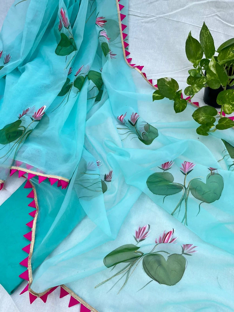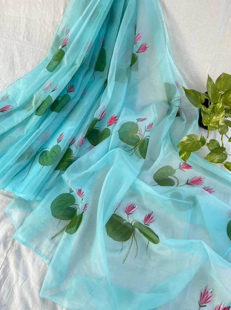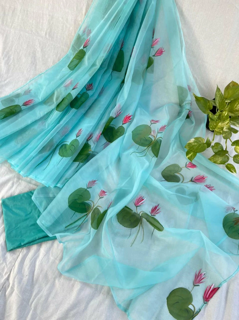 Extremely soft and lightweight glass organza saree with beautiful floral painting and triangle gota patti detailing all over the edges. This saree, unlike other organza sarees, does not stand too stiff when draped. It falls really well and stays in place once draped. If you love organza sarees, purchase this one to believe how easy and light it is!!Â