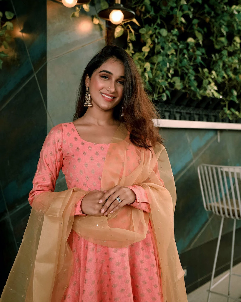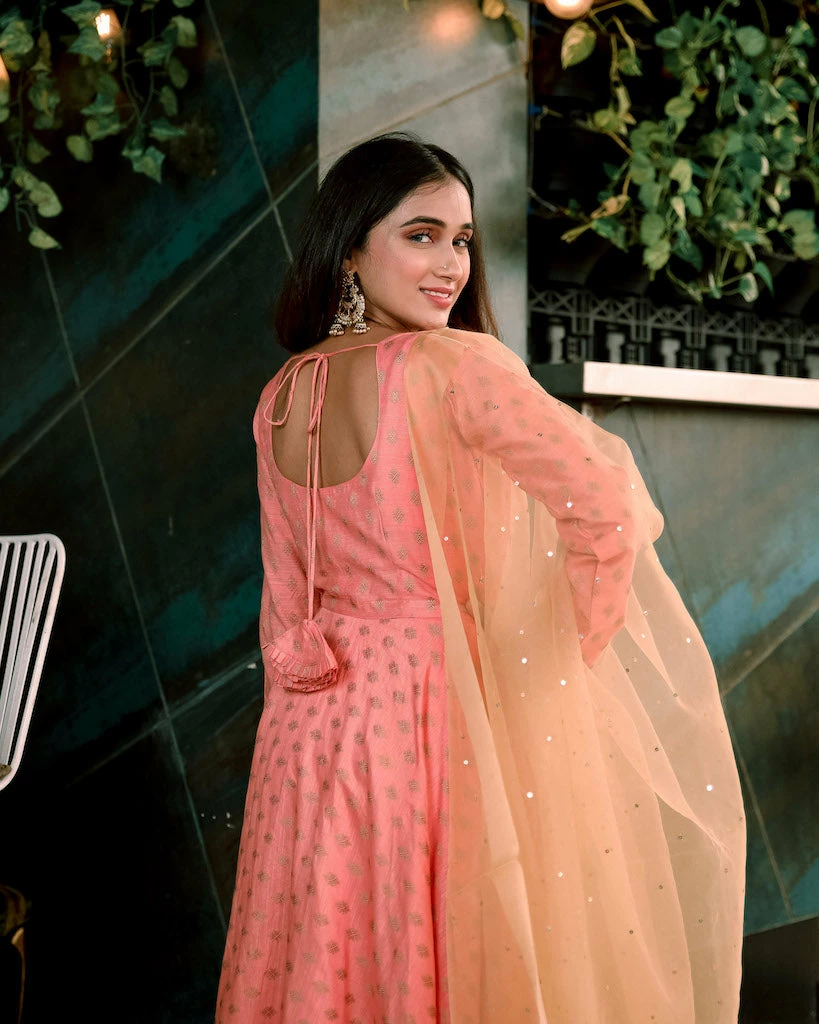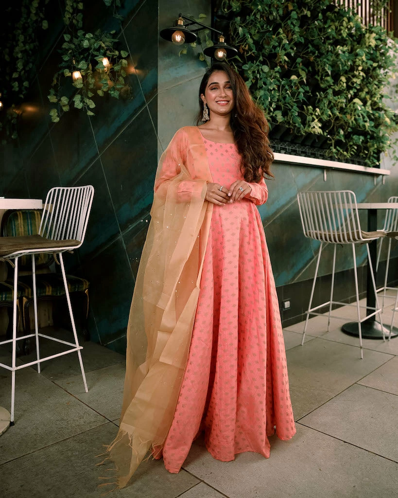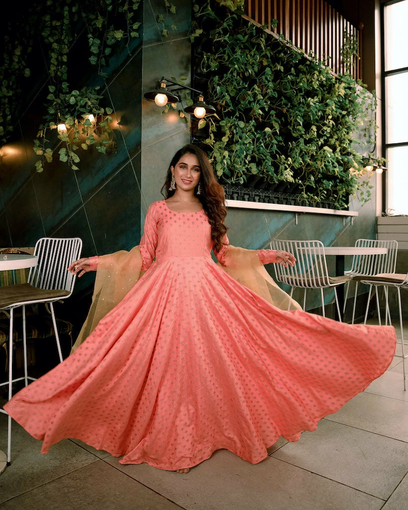 Banarasi Dupion Butta Fit and Flare Dress with Embroidered Organza Dupatta.