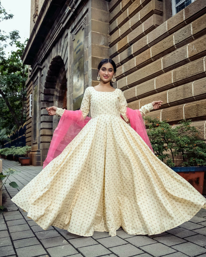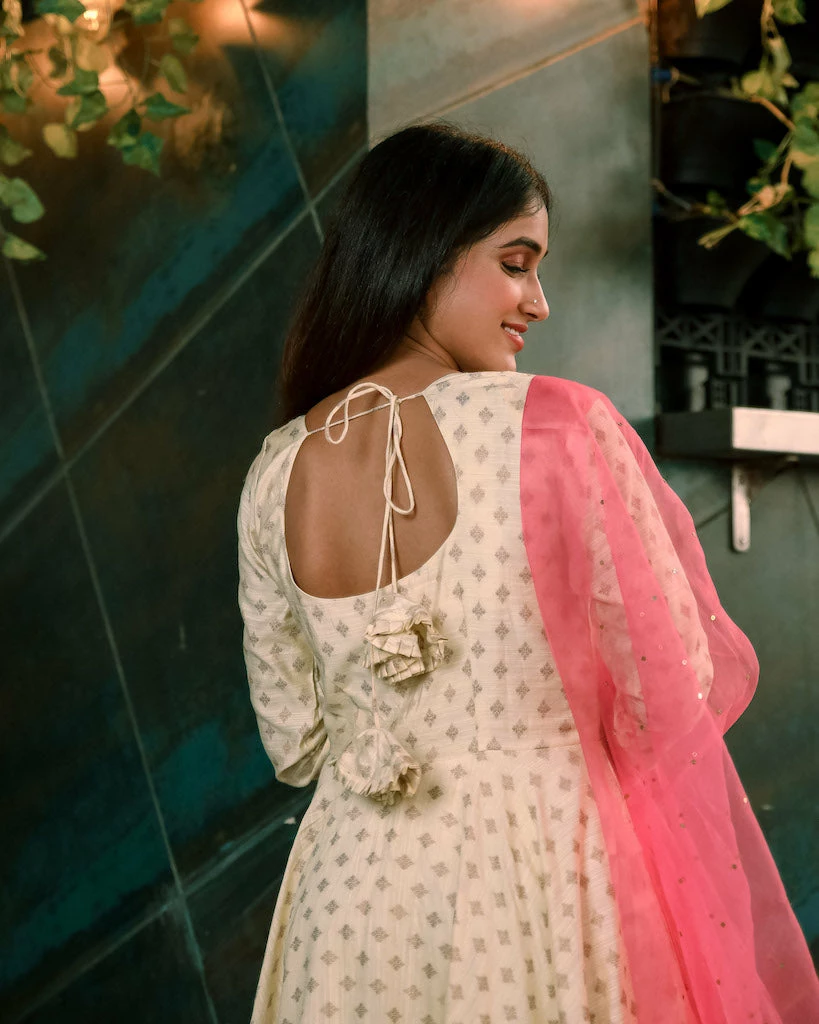 Banarasi Dupion Butta Fit and Flare Dress with Embroidered Organza Dupatta.