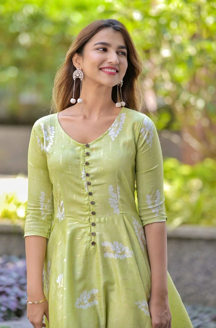 Pastel Foil Printed Rayon Slub Fit and Flare Dress. Feeding Friendly with front open buttons.