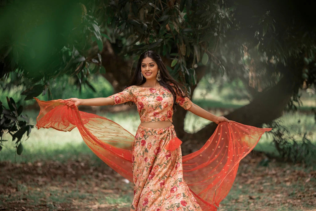 L: Bust-40″,Waist-34″,Hip-42″ , Crop Top Length – 15.5”, Skirt Length-42″