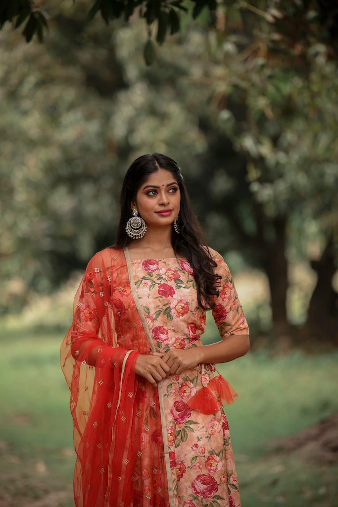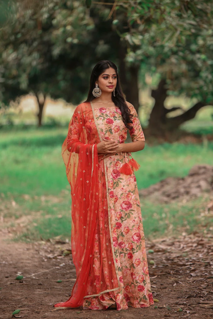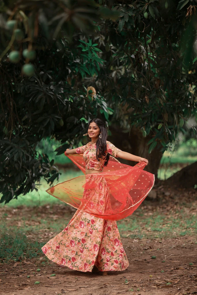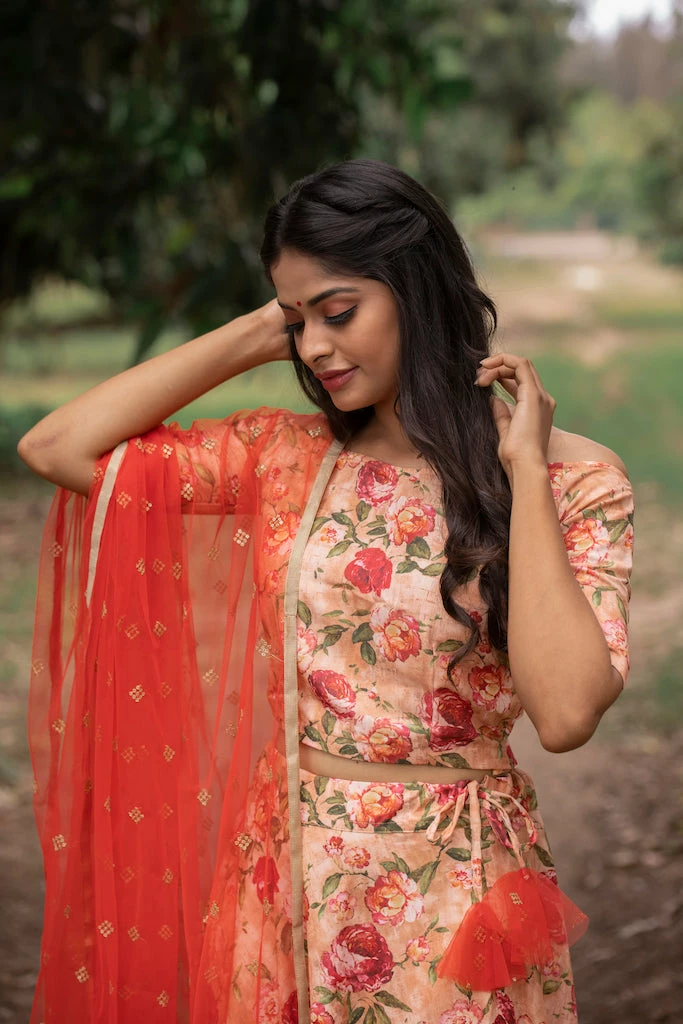 Floral Rayon Off Shoulder Crop top & Skirt with net Dupatta.