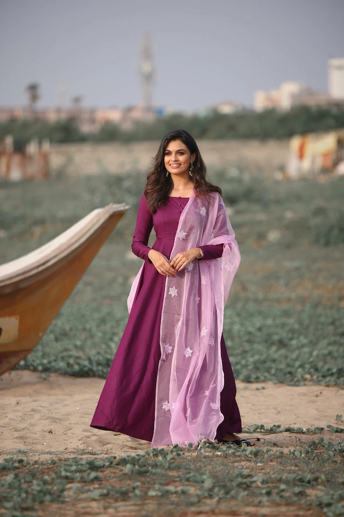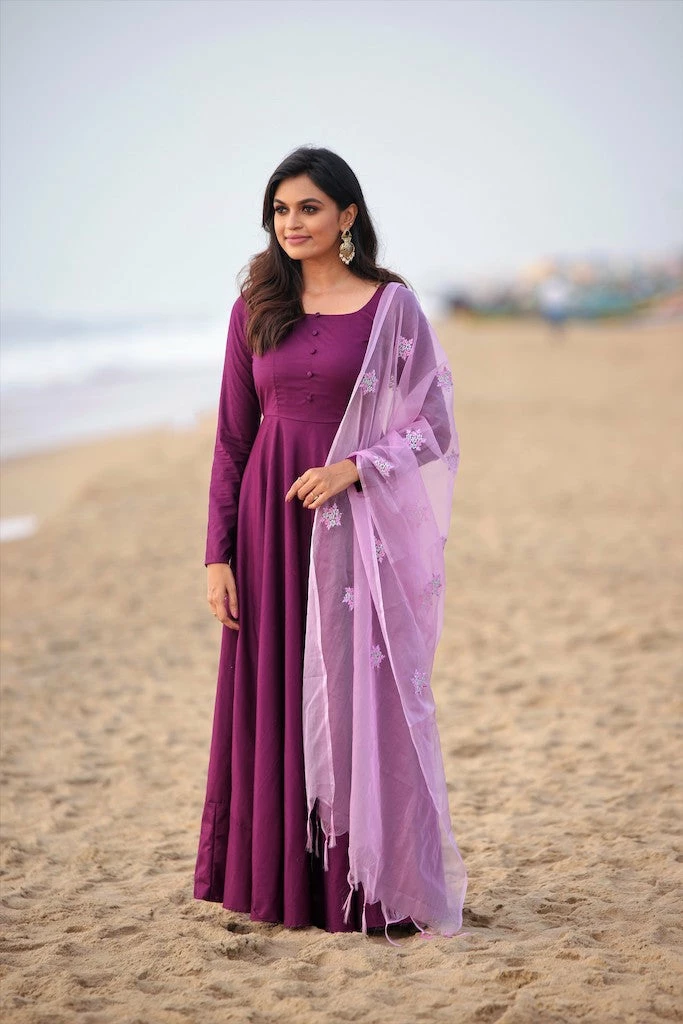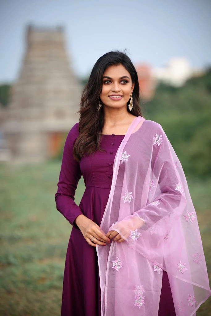Violet Viscose Cotton Silk Fit and Flare Dress with Embroidered Organza Dupatta.