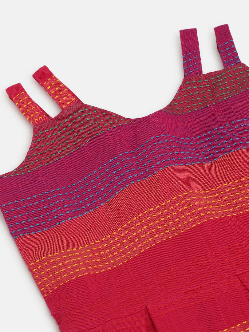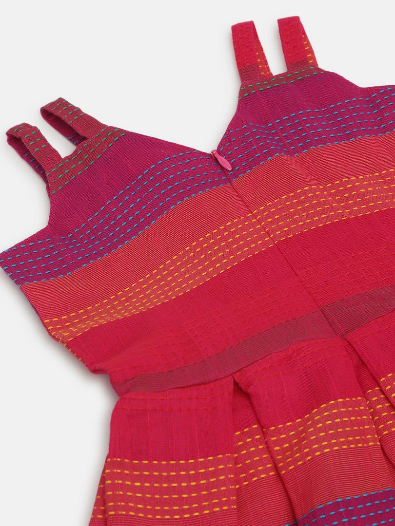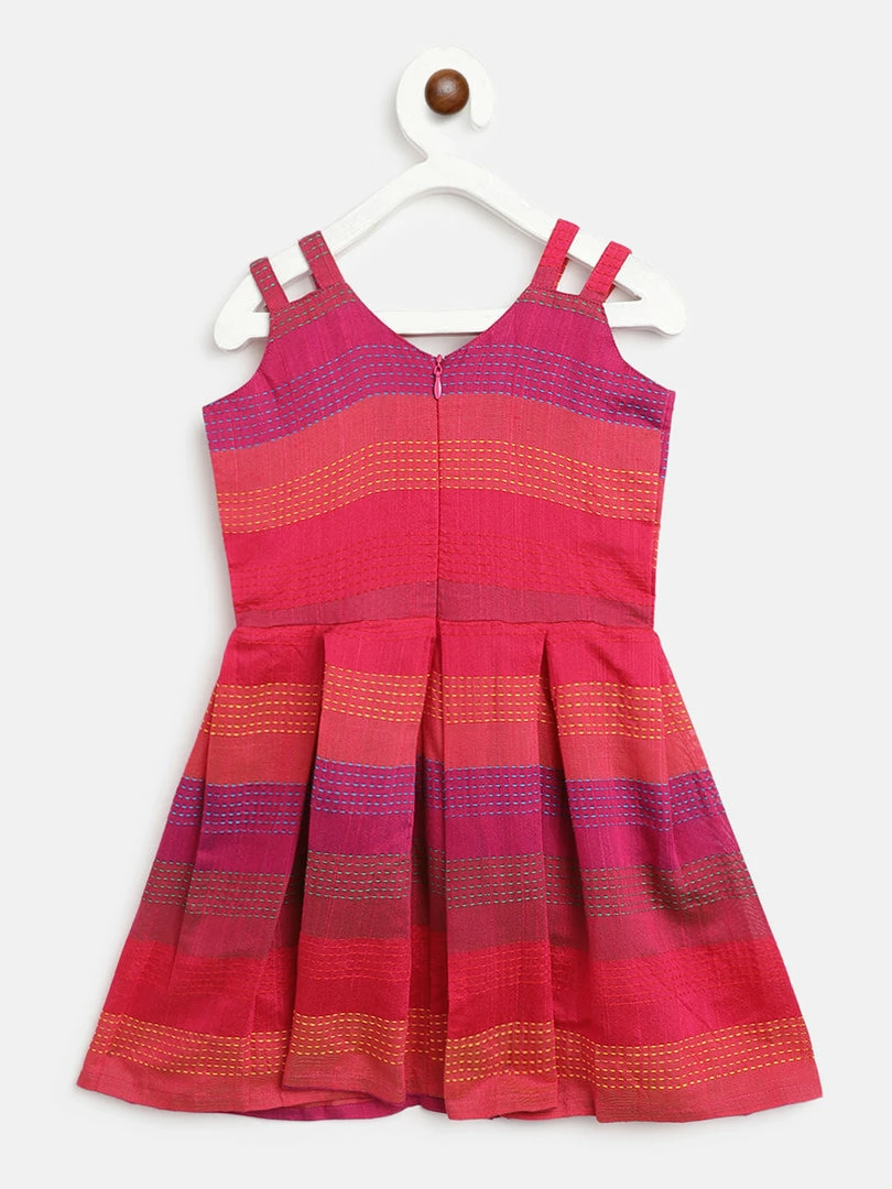 Pink Dupion Cotton Stripes Box Pleated Dress.