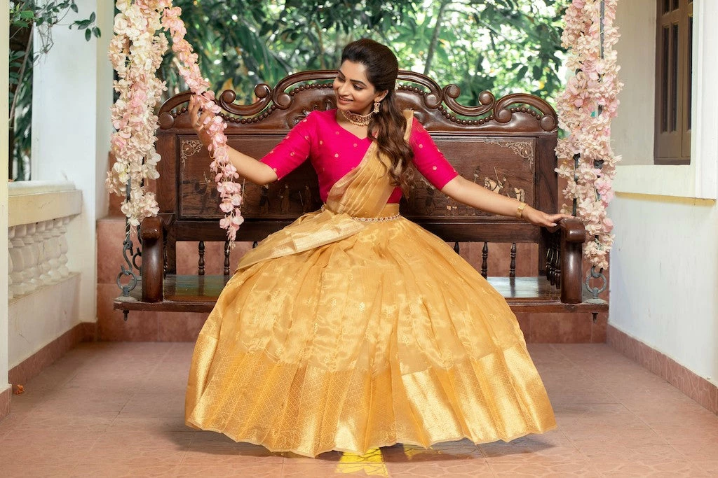 Banarasi Dupion Croptop with Kota Tissue Pleated Lehenga And Mirror Embroidered Tissue Kota Dupatta.The crop Top and Lehenga is lined.