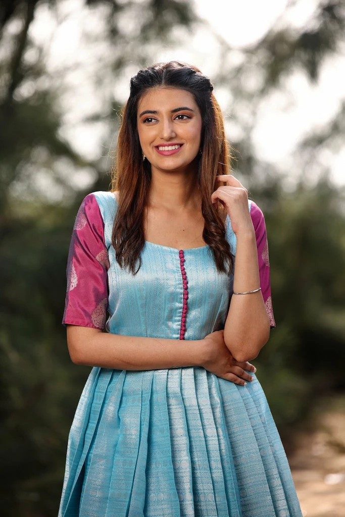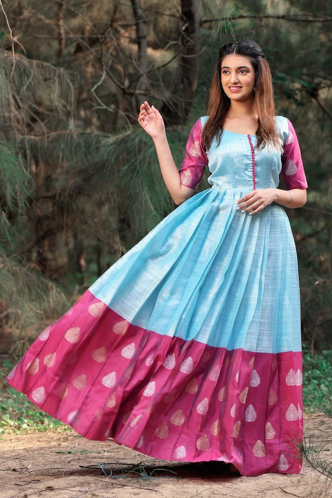 Fit and Flare Fan Pleated Kora Silk Gown with Zari Borders. The dress is fully lined.