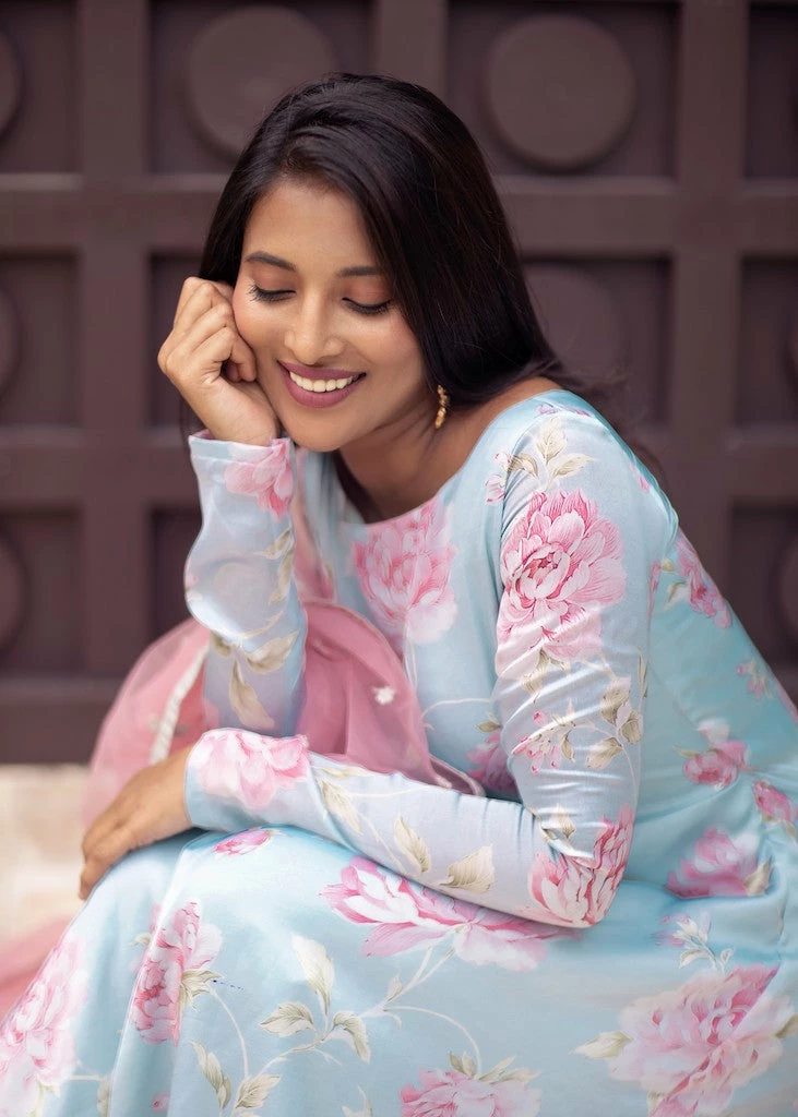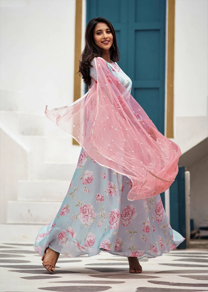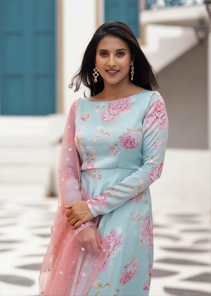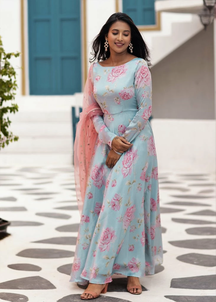 Floral Printed Satin Georgette With Emrboirderd Dupatta.The dress is fully lined.