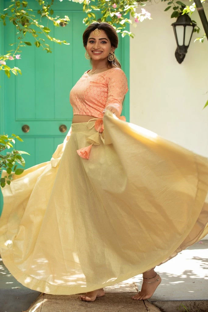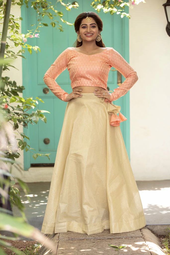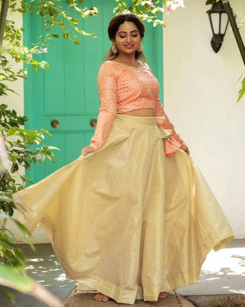 Banarasi Dupion Brocade Croptop with Tissue Cotton Full Circle Skirt.The dress is fully lined.