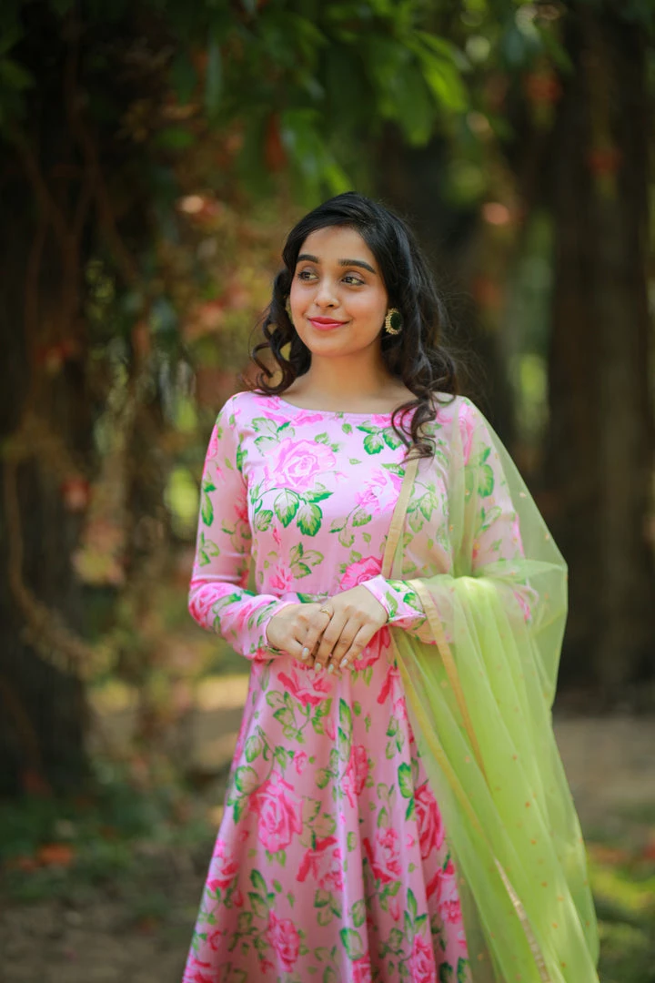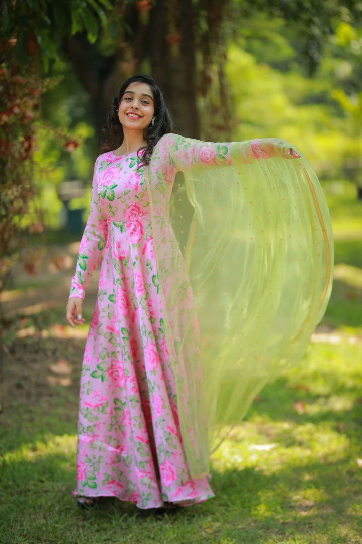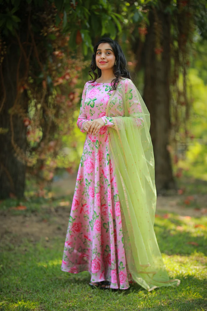 Floral Satin Georgette Dress with Mint Green Embroiderd Dupatta