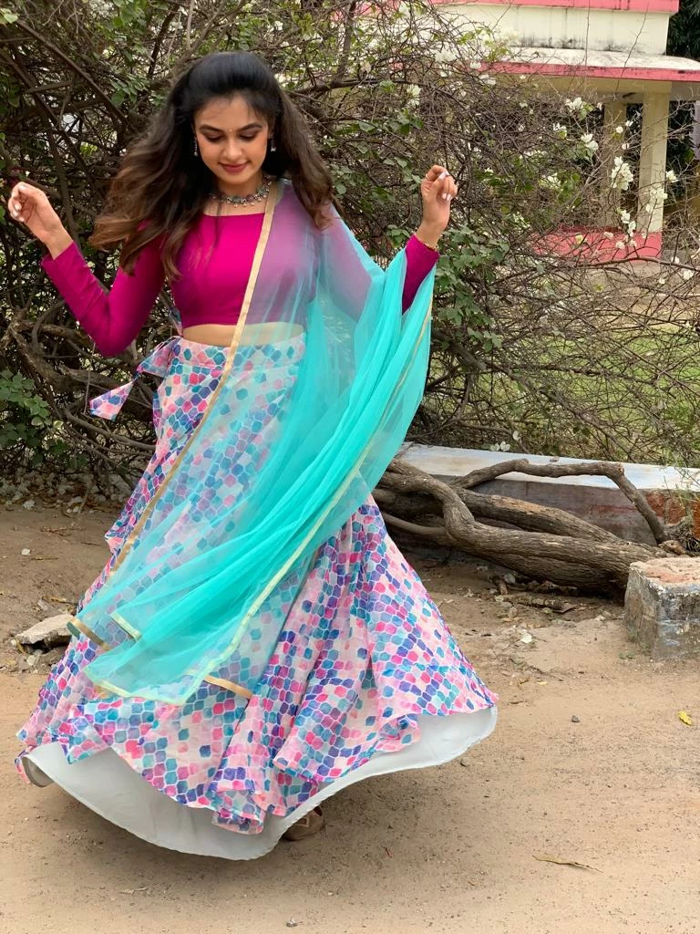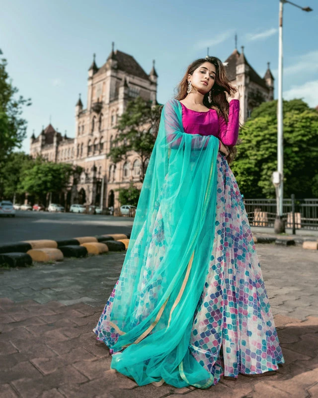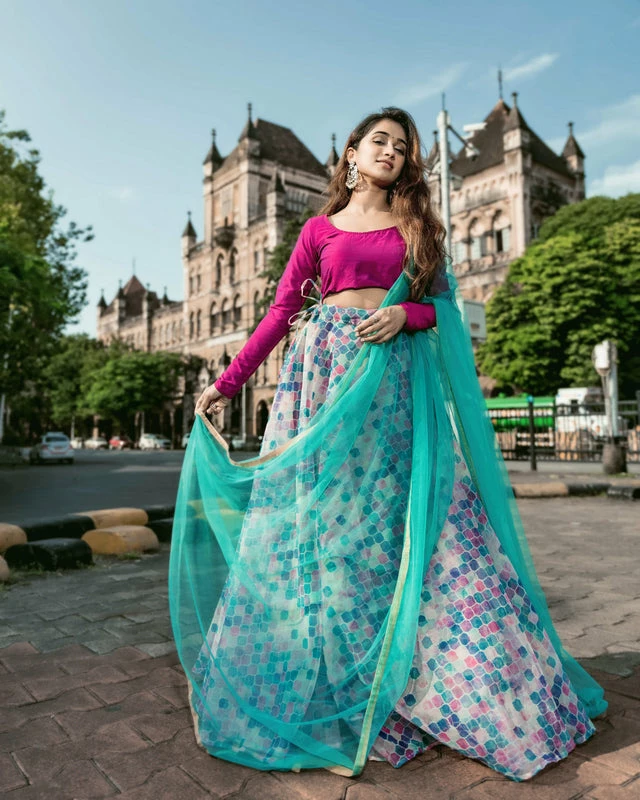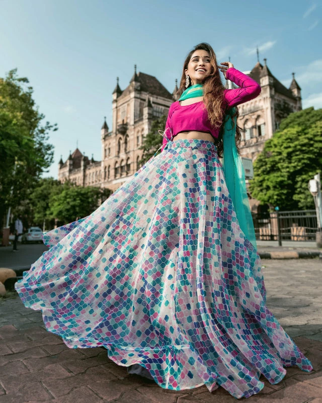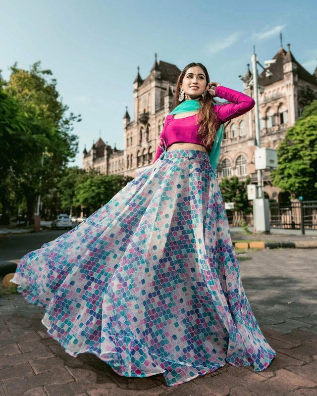 Organza Lehenga with Silk Cotton Blouse and Net Dupatta.