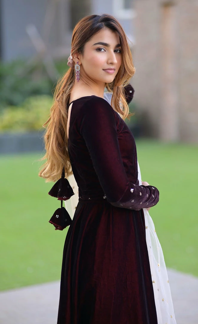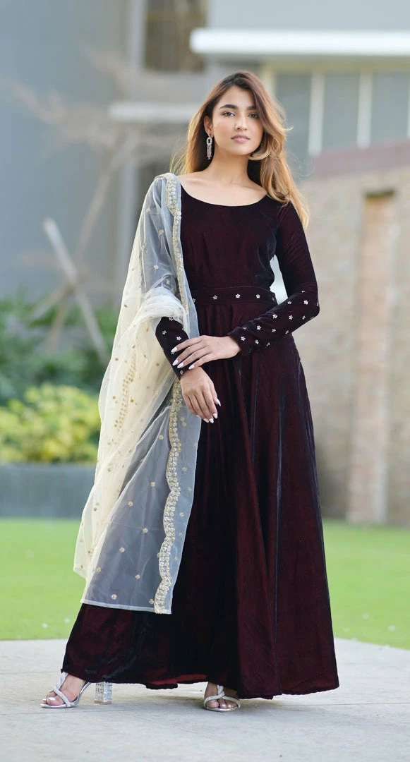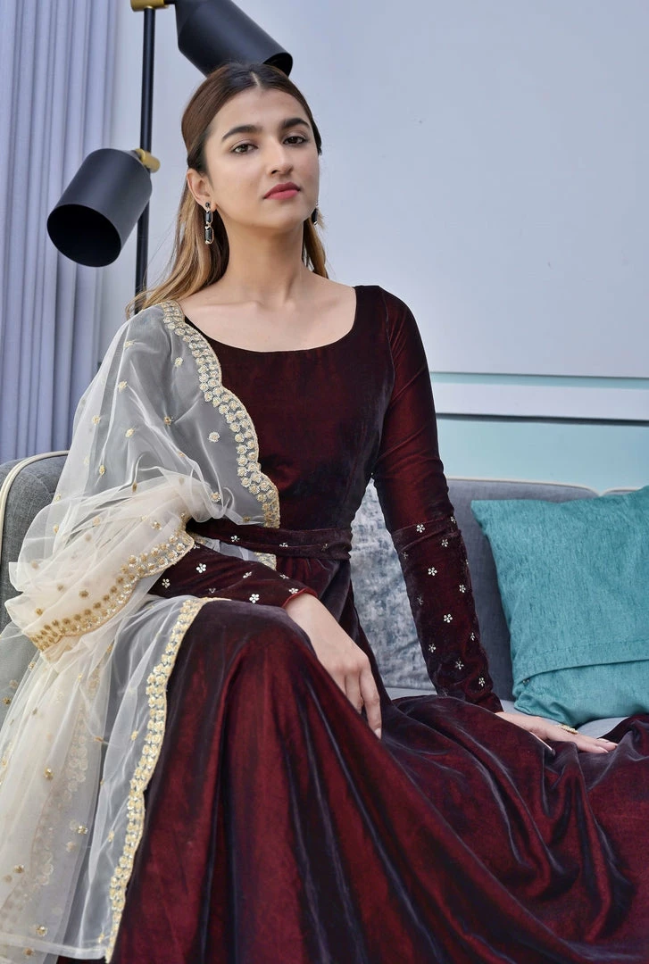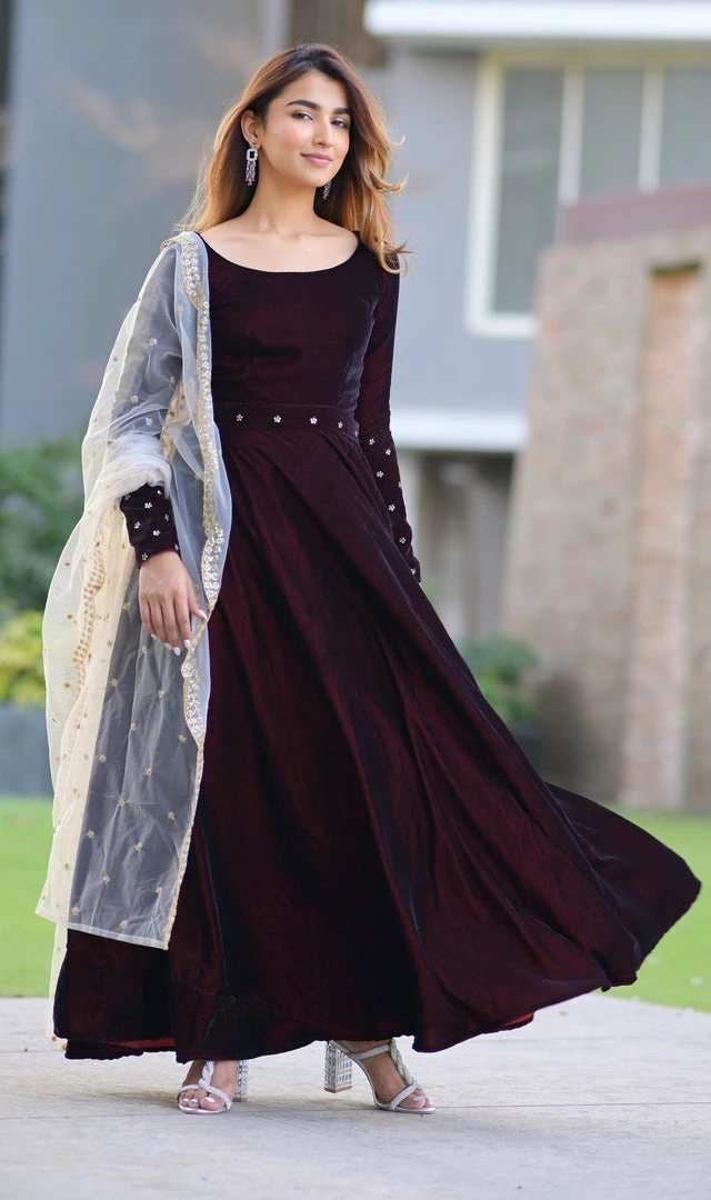 Fit and Flare Velvet Anarkali With embroidered patchworked Sleeve and Embroidered Dupatta and Belt.