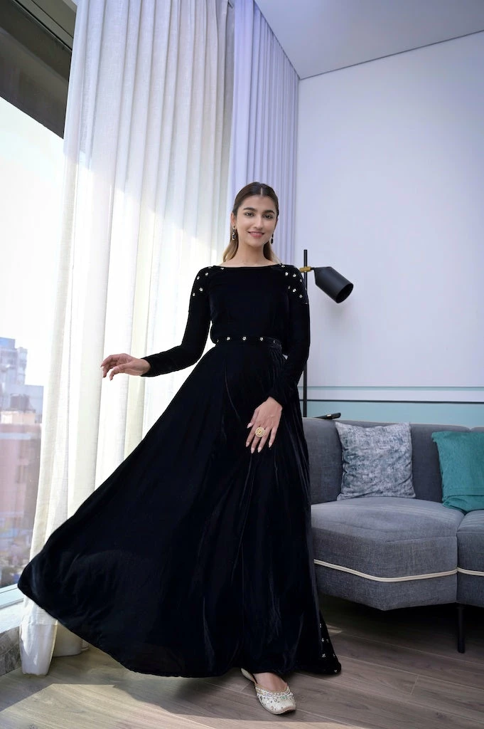 Fit and Flare Velvet Gown With embroidered patchworked shoulders, side flare and belt.