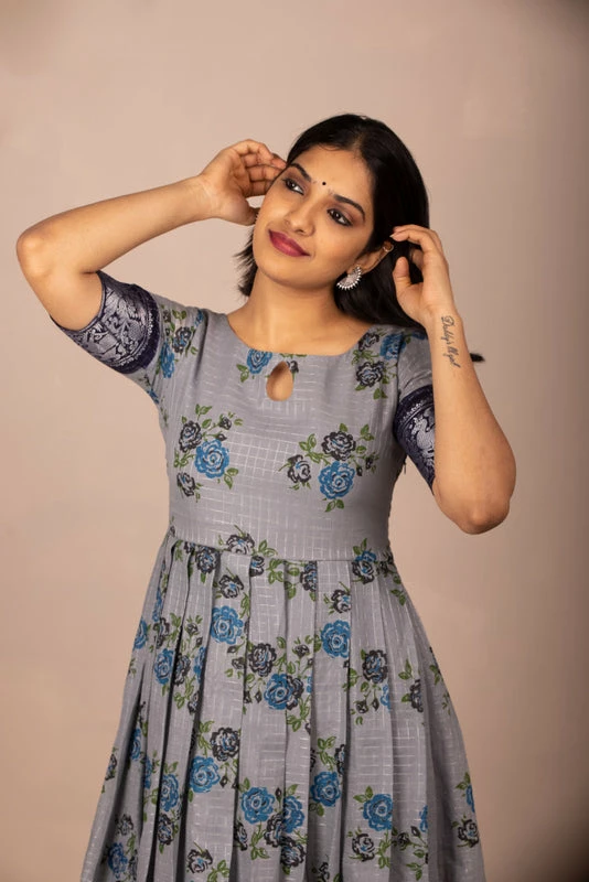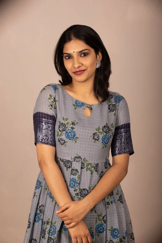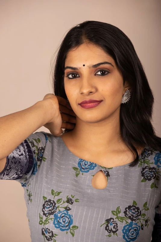 This Sungudi is handcrafted cotton fabric that has been dyed using environment friendly dyes. The floral block print on the zari kattam (checks) adds more elegance to it.