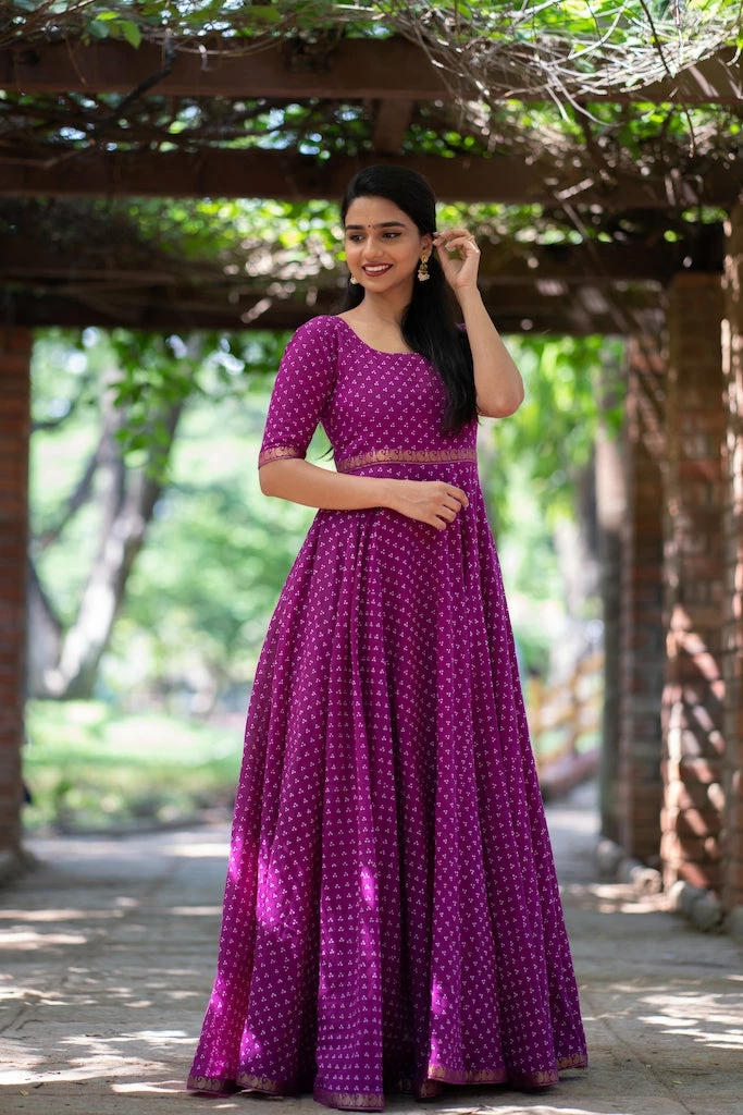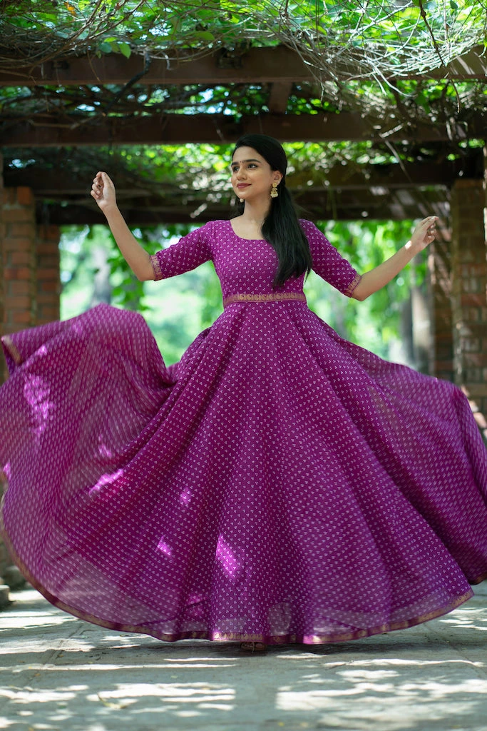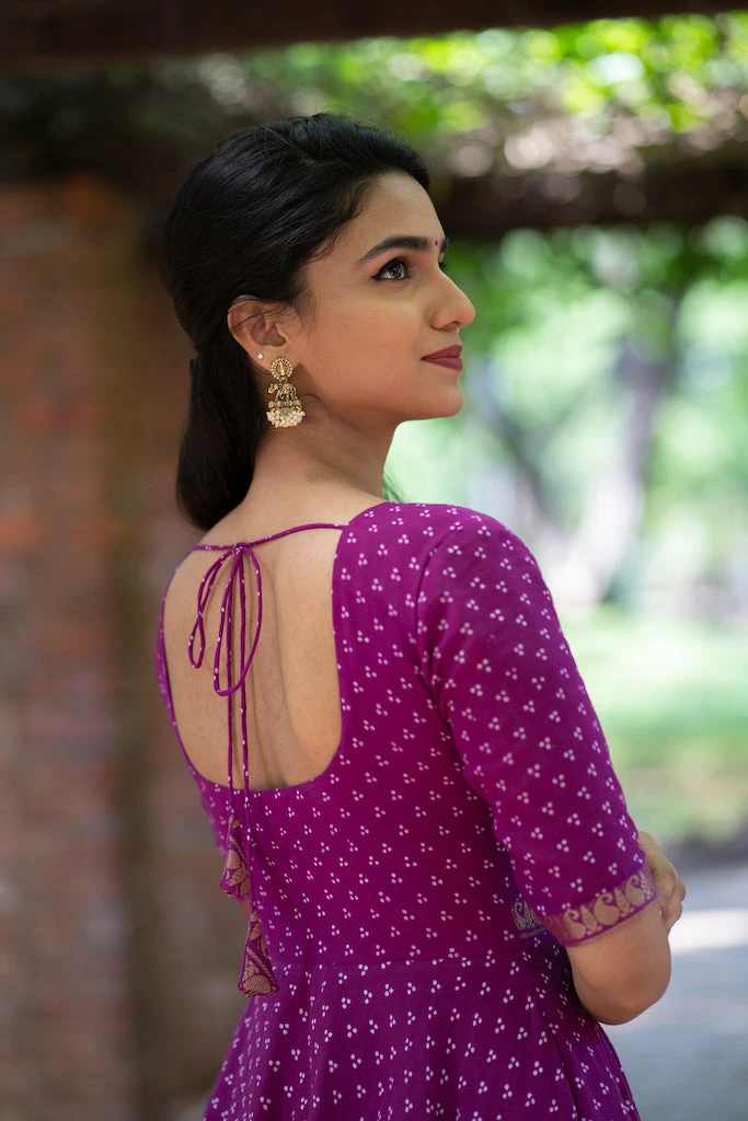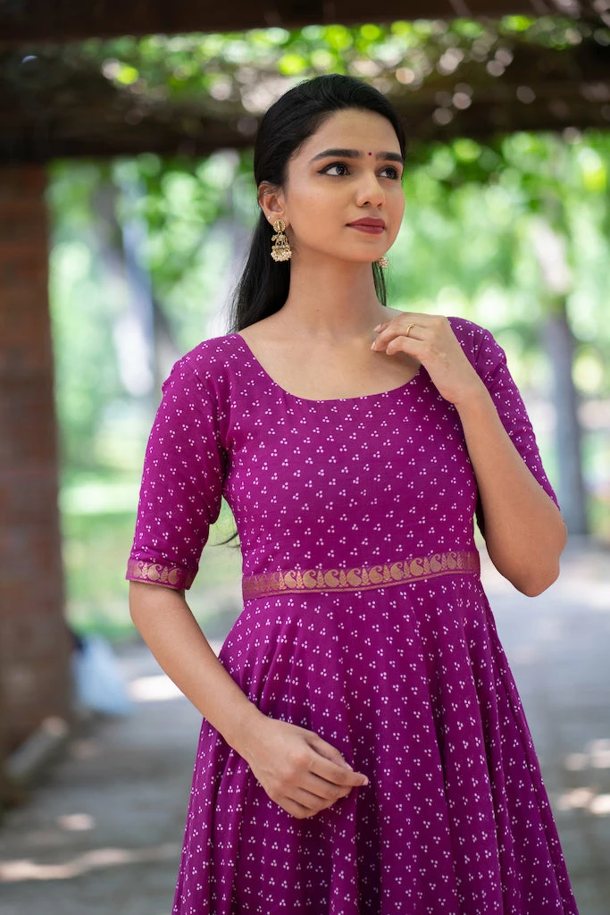 This purple Sungudi is handcrafted cotton fabric that has been dyed using environment friendly dyes.Â