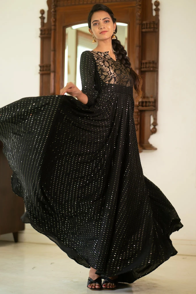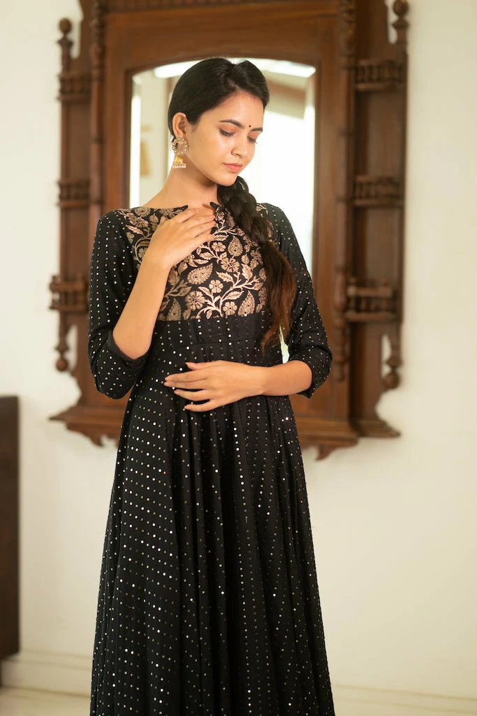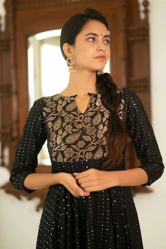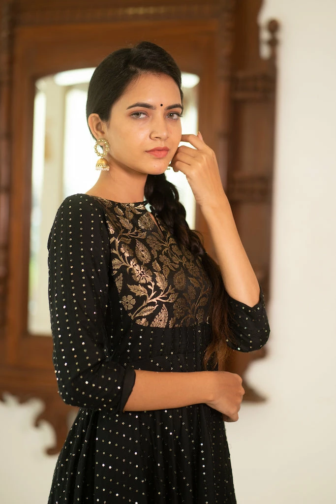 Detailing: yoke with Semi Banaras fabric; loop on the neckline; Sleeves – sequined patch.