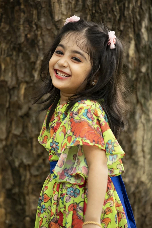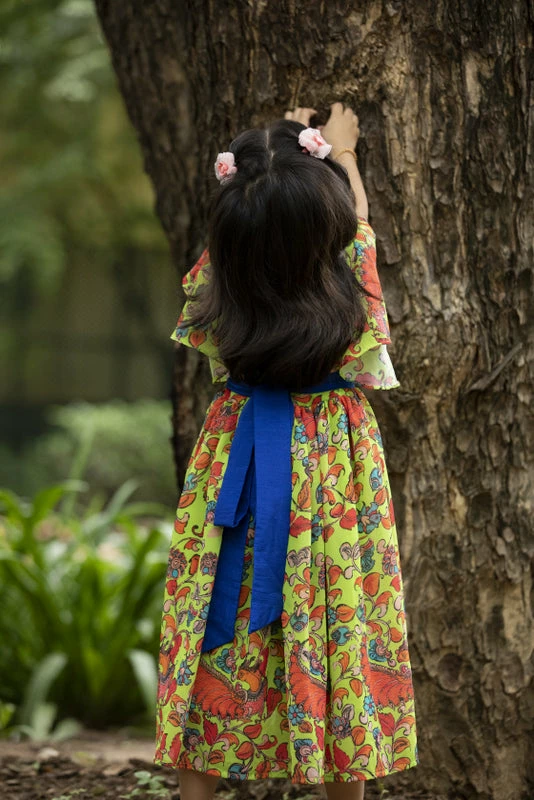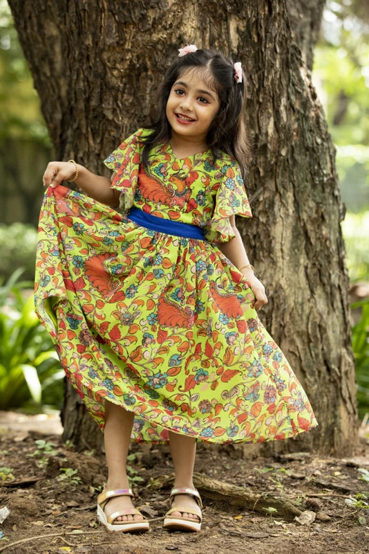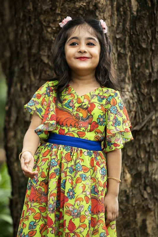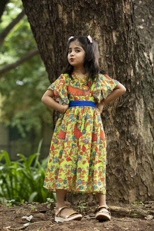 Lawn Green (Faux) Georgette frock in Kalamkari print.Â