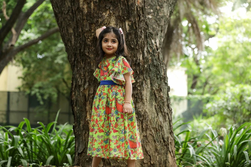 A simple cute frock with scarf, with double cap sleeve detail.Â