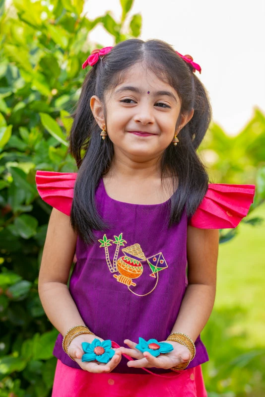 Harvest festival Special Edition. Check out the cute embroidery of Sugarcane , Mud pot and Kite.